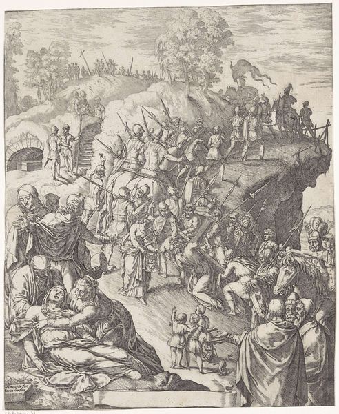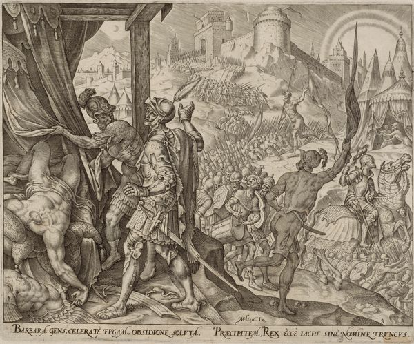 Curator: Let’s take a look at this engraving called “Keizer en gerenaal gevolgd door een leger bij een tuin,” which roughly translates to "Emperor and General Followed by an Army Near a Garden." The piece is attributed to Johann Friedrich Greuter and dates somewhere between 1599 and 1662. Editor: The first thing that strikes me is the almost dizzying level of detail—so many figures meticulously rendered in stark monochrome. It creates a rather grandiose effect, doesn't it? Curator: Absolutely. It’s worth noting that images like this one weren't just about artistic expression. They served a vital function in disseminating political ideas and celebrating powerful leaders. Consider the context: printmaking enabled the broad circulation of propaganda. Editor: I agree; however, I can’t help but observe the stark linear quality dominating the piece. Note the parallel strokes of the lines generating form, shadow and texture. Curator: Indeed. The very deliberate composition guides our eye from the garden, and classical fountain in the foreground—hinting at cultivated order and prosperity— towards the regal figures and the amassed army which occupy center stage, all under the watchful gaze of the fortress, or city walls behind. It's carefully staged to showcase imperial power and authority. Editor: Though, let us also consider the lettering at the base; POMIS SVA NOMINA SERVANT. Could this allude to symbolic representations embedded in the imagery, suggesting deeper layers of meaning intended for informed or literate audiences? Curator: It does appear so. And of course, you can think about the choices in that landscape beyond, its depiction not purely for aesthetics but perhaps alluding to some kind of territorial claim, which must have resonated powerfully with viewers at that time. It places military campaigns into a historical lineage. Editor: Quite. Though the print is very compelling on visual level, the density in the composition has a peculiar flattened-perspective appearance which does reduce some dramatic tension despite the overt depiction of military pageantry. Curator: Well, whether it succeeds aesthetically for all viewers across centuries, its cultural value remains undeniable. Thanks for offering that alternate viewpoint on our history, and allowing it all to come to life. Editor: Likewise, exploring art’s intersection with society and politics has been insightful!