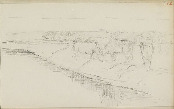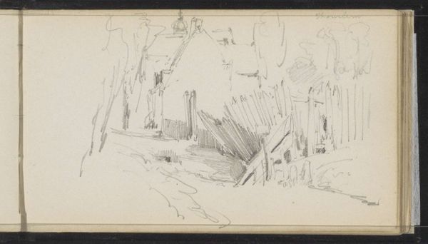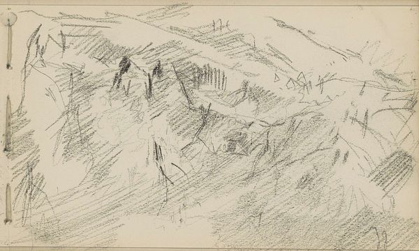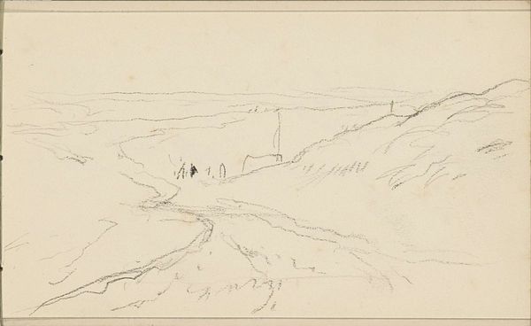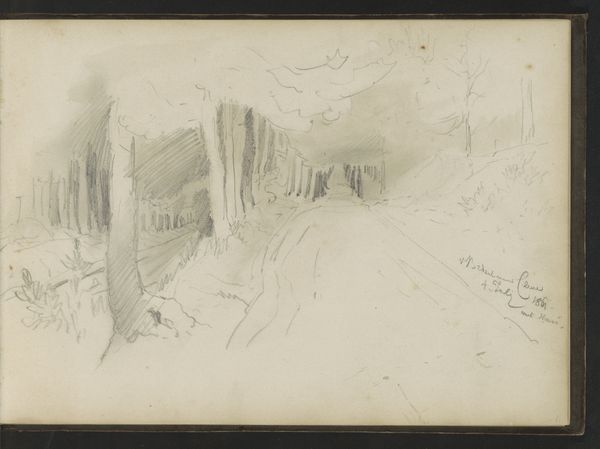 Curator: We’re looking at "Figuur op een pad in het Haagse Bos," a pencil drawing by Johannes Tavenraat, created in 1871. It resides here at the Rijksmuseum. Editor: Wow, it’s kind of…haunting, right? All those stark tree trunks and a lone figure disappearing into the woods. Feels a little melancholy. Curator: Yes, Tavenraat certainly captures a specific mood. Consider the romanticism at play, the emphasis on nature’s grandeur and humanity's small scale within it. Notice how the verticality of the trees establishes a rigid structure while the soft pencil strokes render a very yielding forest floor. Editor: I see what you mean about the structure; it’s almost architectural. But that little figure? He’s the whole story for me. Where is he going? What’s he thinking? Is it cold? The mind wanders in those woods, doesn't it? Curator: Indeed. That figure offers a point of entry, inviting speculation, yes. I am interested in how Tavenraat uses line weight to suggest depth; note the economy with which the artist has constructed an atmospheric perspective. This exemplifies the period's inclination for detailed landscapes enlivened by intimate, almost genre-painting elements. Editor: Genre elements indeed. You almost miss him there; it also plays with themes of solitude and maybe the sublime. What about the way Tavenraat used the negative space here, especially at the top? All those bare patches of paper feel like a raw invitation. It’s like the drawing’s not quite finished… intentionally, I think. Curator: That very rawness is essential; the piece functions as a preliminary exploration of form and space, encapsulating the Romantic sensibility of imbuing natural forms with emotional content. It reflects broader philosophical and artistic currents, particularly an interest in conveying an immediacy of experience. Editor: It certainly has that effect. It makes you wonder if Tavenraat was actually *there* at that precise moment… feeling the cool damp of the forest and scribbling his way through the bracken. Thanks. I am strangely ready to read some Thoreau. Curator: The emotional connection certainly remains even today. This drawing remains significant as a prime example of late 19th-century Romantic landscape practice.