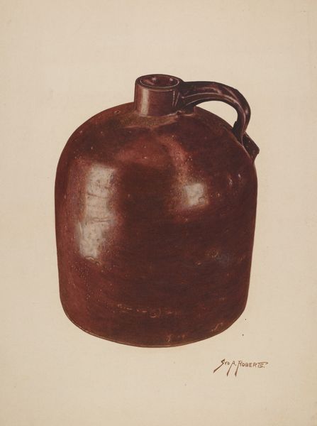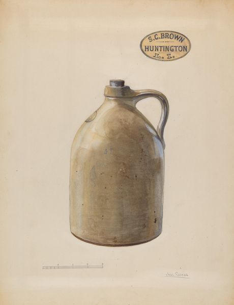 Curator: Here we have Annie B. Johnston's "Stoneware Jug," created around 1937. It's rendered with such delicate precision. Editor: It's the color that gets me first. That earthy, almost honeyed, tone of the jug—it feels incredibly grounded, solid. A quiet kind of strength. Curator: I find the jug almost archetypal. A vessel, quite literally, for holding and preserving. Its simple form speaks volumes about folk traditions. Notice how carefully Johnston captures the variations in tone, suggesting the cool touch of the pottery itself. Editor: Absolutely! A humble jug, yet it echoes ancient amphorae. Consider its rounded belly, almost womb-like, connoting both nurture and secrets. There's a connection here to our most basic needs—water, food, sustenance. And this humble utilitarian object has been elevated. Curator: The inscription above the jug— "Stevens Bros. & Co. GA, Stevens Pottery" — offers a tangible link to a specific place and maker. This image may even celebrate local craft and commerce during its time. It certainly reflects an appreciation for handmade objects in the face of industrialization. Editor: And isn't it interesting that she chose this particular object? There is no overt action or narrative—it's almost iconic. The stoneware jug, as rendered in gentle watercolor, invites us to contemplate daily existence, almost like a secular still life of the South. A memento from an unhurried past. Curator: What I appreciate most is the blend of the everyday with something approaching reverence. This humble jug is a record of cultural persistence—a link to a time when simple objects held immense value and purpose. Editor: It leaves me pondering how much meaning we imbue in ordinary items, how objects can tell untold stories about ourselves and about forgotten eras, and echo our own deep and very old pasts.