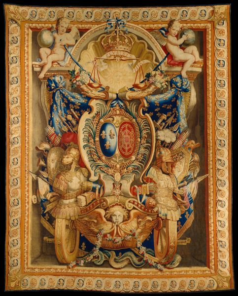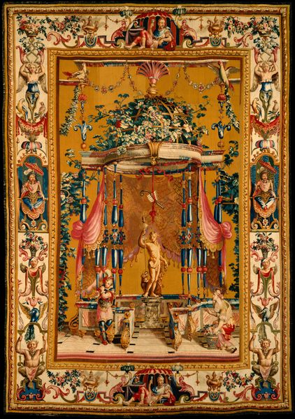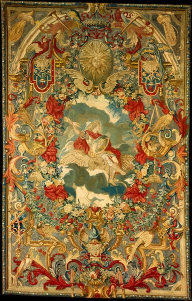 Curator: What strikes me first is the density of ornamentation. The composition feels quite busy and yet there's a visual rhythm in the repeated motifs and use of color. Editor: Indeed. This is "An Allegory of Spring," a textile work conceived by Charles Lebrun around 1680, and currently residing here at the Minneapolis Institute of Art. We're looking at a large tapestry woven from wool and silk. Knowing the historical context, specifically the reign of Louis XIV, really shapes how one interprets the piece. The decorative art served to bolster the image of the Sun King, framing him within a narrative of divine right. Curator: I see that now in the symbols, particularly the regal eagles at the bottom, supporting that urn brimming with flora, and even those hunting trophies at the very top which represent domination and power. However, beyond the clear intent to demonstrate absolute power, how are we to understand it through today's cultural lens? Can we embrace the tapestry as just one more beautiful piece, or do we acknowledge its purpose? Editor: That’s an essential question. Can we appreciate the technique, the formal arrangement of elements, the play of light across the different textures, without fully condoning its political agenda? The figures feel intentionally posed in a balanced composition with clear symmetry. However, understanding its role in constructing and reinforcing power structures cannot be ignored. It reflects how art, throughout history, has been interwoven with systems of power, patriarchy, and colonialism. This artwork's power lies in its engagement with cultural politics. The composition's structural devices work in harmony to serve the purpose of power, a symbolic display intended to justify power. Curator: The very fabric speaks of the aristocratic world from which it was created. What I find really captivating about the artwork is its inherent tension between propaganda and masterful construction. Do you see those implied frames, how the narrative seems to emerge from various perspectival planes, almost in trompe l'oeil fashion? Editor: Absolutely. And perhaps that tension you mention is precisely what makes it a compelling piece for contemporary audiences. By unpacking these historical works, examining the role of gender, and exploring systems of power, we expose historical structures but are also able to understand present biases. Curator: Looking closely allows us to see past its inherent artifice and see it instead as a cultural artifact. Editor: It also invites us to interrogate not only art history but its relationship to theory. A valuable invitation indeed.