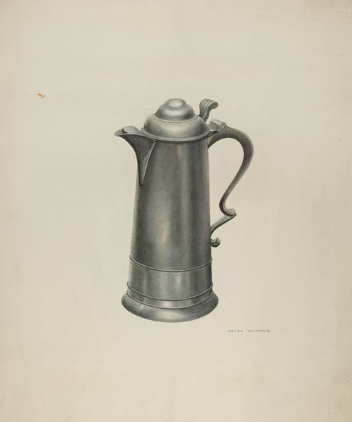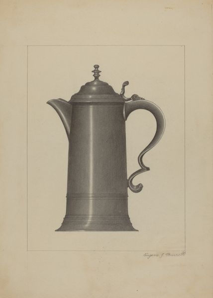 Curator: There's something almost melancholic about the realism in this work, don't you think? It has a quiet stillness. Editor: Absolutely. We're looking at "Pewter Flagon," a pencil drawing from sometime between 1935 and 1942, by Eugene Barrell. I am struck by how meticulously rendered the surface of this metal object is. The soft gradient in values across the drawing make the cylindrical form look realistic and touchable. It almost appears staged, under dramatic, focused light. Curator: The choice of a pewter flagon is quite interesting, isn't it? It brings to mind images of early American taverns and domestic life—a world of warmth and communal gatherings around hearths. Even the choice of media--pencil drawing with possible hints of watercolor--feels almost quaint or traditional, especially when viewed from a contemporary lens. But let’s not romanticize; this era, framed by the Depression and the beginnings of war, probably had a far more ambivalent relationship with this sense of cozy domesticity than we’d imagine. Editor: Yes, a flagon represents more than just a container; it’s a vessel holding communal traditions, familial memories and a symbol of sustenance. Its weight is substantial – both physically and symbolically. The very material itself is suggestive. Pewter, unlike gold or silver, doesn’t signal overt wealth, but suggests a more grounded, practical elegance. And notice how Barrell captured its subdued lustre, perhaps indicative of simpler times, far removed from the ostentatious displays of industrialized wealth. Curator: I agree, the object here certainly has ties to simpler, more humble times, however, it does bring to mind questions about function and display during this historical period. One wonders about this object's original purpose, and about Barrell's purpose when creating the work: Is it an exercise in replicating visual accuracy or a broader commentary on how material objects define domestic life and historical context? Editor: Maybe it is about endurance, something stable and familiar to cling to when everything else felt precarious. After all, it’s been around centuries, hasn't it? That same shape, used for generation to generation. Food, drink, family...These simple things transcend political and social changes; perhaps Barrell sought that simple thread through tumultuous eras. Curator: Yes, perhaps it speaks to that idea of continuity, and finding meaning and connection through tangible things. That resonates, particularly in an era marked by great upheaval. Editor: A beautifully considered artwork. Thank you for sharing its layers.