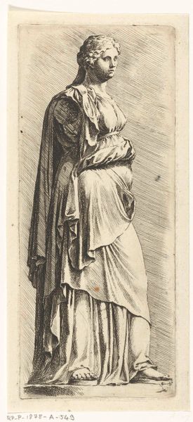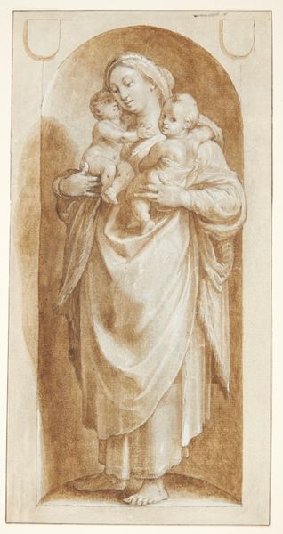 Editor: Here we have Johann Baptist Scholl the Younger’s pencil drawing, “Statue des Heiligen Bonifazius,” housed here at the Städel Museum. The precision is astounding; the shading, and those meticulously rendered garments...it almost feels like gazing upon a sculpture rather than a preparatory sketch. What strikes you when you look at it? Curator: It feels like glimpsing the ghost of a monument, doesn't it? I mean that both visually, with those ethereal pencil lines, and conceptually. Think about what a statue represents – permanence, established power. But here, Scholl captures it in this fleeting medium. Almost a visual paradox! He asks, in a sense, how solid these figures really are. And Saint Boniface himself, planting the seeds of Christianity in Germanic lands… were his roots as firm as the cathedrals that sprung up after him? Editor: That's fascinating! So you see that the fragility of the medium sort of undercuts the intended message of power? Curator: Precisely! Consider that kneeling figure seeking…something. Forgiveness? Blessing? Is the Bishop truly offering it or merely… allowing it? This pencil is, as I consider it, a tool for doubt, for seeing what grand gestures can obscure. What do you make of the setting itself, that somewhat vaguely defined architecture in the background? Editor: It gives me the impression of existing almost everywhere or nowhere, it gives an overall sensation of dreaminess to this piece. Curator: A brilliant observation! A place both everywhere and nowhere—very much like the notion of sainthood itself, eh? Almost unattainable yet ever-present. Thank you for sparking that for me. I'll look at this piece differently from now on. Editor: I am glad. And I’ll remember that sketches can hold just as much… maybe more… weight than the finished monument.