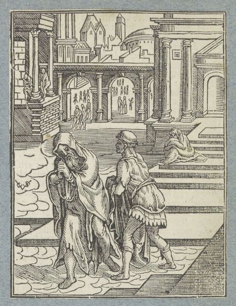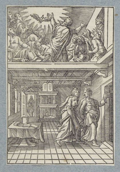 Editor: So this engraving, "Mordecai of Haman Before Ahasuerus" by Christoffel van Sichem II, dates back to the mid-17th century. It’s intensely detailed for a print, and almost feels theatrical with its crowded composition. What strikes you when you look at this work? Curator: The potency of visual language. Look how Sichem uses spatial dynamics and figural arrangement to narrate the story. What biblical scene does it evoke? Editor: It's from the Book of Esther, isn't it? Where Mordecai refuses to bow to Haman? Curator: Precisely. Sichem isn't merely illustrating scripture; he's offering a commentary on power, piety, and persecution. Notice how King Ahasuerus is elevated on the dais, clad in Romanized armor; this symbolizes worldly authority, while Mordecai, kneeling, represents moral integrity. How does the engraver reinforce this contrast through the composition itself? Editor: Mordecai is lower, smaller…more vulnerable, certainly. It emphasizes his defiance against this powerful king. Curator: Yes. And consider the symbolic weight of Haman’s absence! This visual omission underscores Mordecai's triumph of character – he is vindicated by his very presence before the King. Sichem presents a powerful lesson using the visual codes that resonated with his contemporaries. How relevant are the lessons of moral courage that this work of art teaches us today? Editor: That’s a really powerful idea…how the image reinforces a story that is timeless, and relevant even today. I hadn't considered it in that light. Curator: These early prints served a didactic function and remain incredibly powerful cultural artifacts, encapsulating a complex history in a single image. Editor: Thank you. This has reshaped how I see these older artworks, beyond just pretty pictures to vessels of layered meanings!