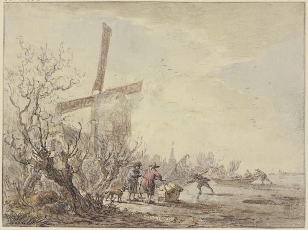 Curator: We are looking at "Winter Landscape with a Ship Lift and Windmill", a watercolor and ink drawing attributed to Jan Hulswit. Editor: It’s quite beautiful, this snowy vista. There's a melancholy about the frozen landscape that’s rather captivating. All of this human labor caught in the still cold. Curator: Precisely! The sheer variety of activity, all centered around this ingenious machinery: a ship lift powered presumably by that very prominent windmill, demonstrates human engagement with their environment. Editor: The windmill is striking—a real visual anchor. And I notice a second, more distant one in the background. What's the symbolic importance here? Are they standing in for more than simple wheat grinding? Is it the constant presence of human industrialism? Curator: Absolutely. These windmills become representative of Dutch innovation and adaptation; remember that land reclamation through drainage was fundamental to Dutch prosperity at that period. Hulswit places these mechanical structures to emphasize our constant reshaping of the landscape. Editor: I see so many layered symbols now; you pointed this out so helpfully. It goes beyond pure topography. Note the clothing of the figures and even the positioning of the boats to the left – there’s more there than one first notices! They almost form little emblems. Curator: Indeed. He portrays not only the visual landscape but the social dynamics, hinting at class and gender roles inherent to a thriving river society. Editor: So the materials and craft also subtly communicate that which a purely art-historical or historical explanation fails to grasp. Very intriguing! I find it difficult not to reflect on it, imagining what kind of conditions such construction might be involved with! Curator: Well put. By examining these kinds of details we enrich our appreciation and insight into the lived world within the art. Editor: I leave appreciating all the new visual layers now present, a rich social and emotional panorama behind the pastoral scenes.