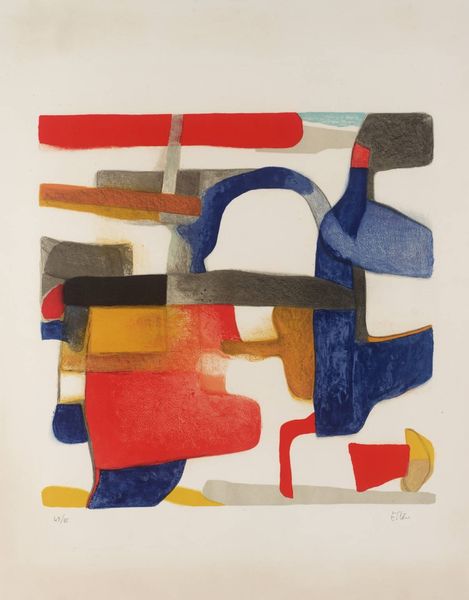 This untitled print was created by Sonia Delaunay sometime during her career. It features a vibrant array of colours arranged in a circular composition of squares. These blocks of colour, from reds and blues to greens and blacks, create a harmonious yet dynamic visual experience. Delaunay’s work often explored the interactions of colour and form, a style she termed ‘Simultanism.’ In this print, the arrangement of colours creates a sense of movement and depth, destabilizing any fixed perspective. The geometric structure of the squares contrasts with the overall circular shape, challenging our expectations of order and symmetry. The print engages with broader ideas about abstraction and representation. By reducing forms to their essential geometric shapes and focusing on the interplay of colour, Delaunay invites us to reconsider how we perceive and interpret visual information. The tension between the geometric and the organic, the static and the dynamic, embodies a play that resonates with the artistic and philosophical currents of the early 20th century.