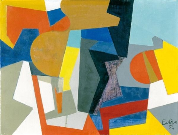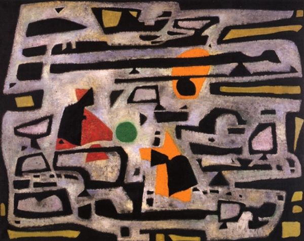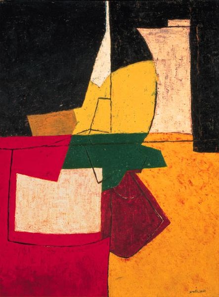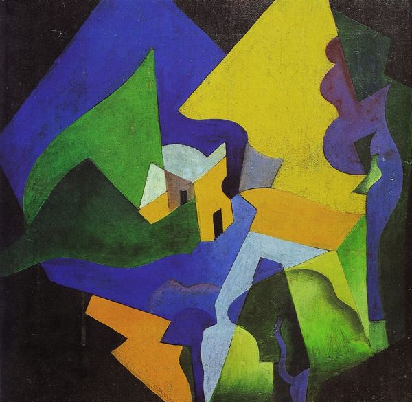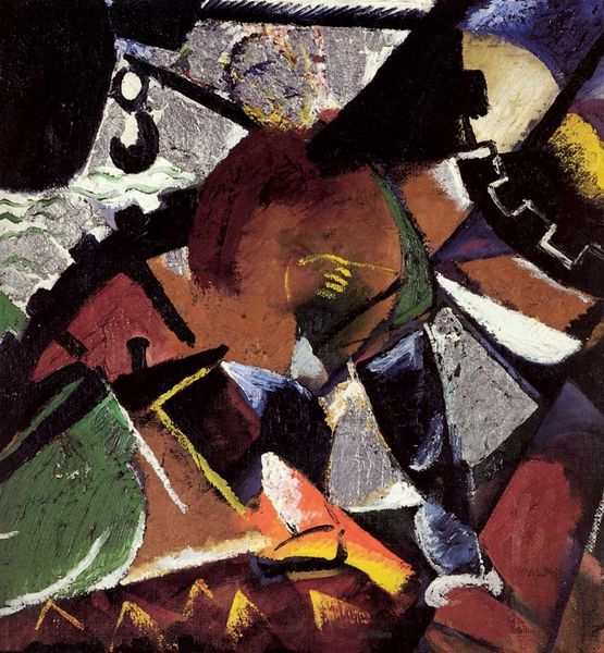 Curator: We're looking at *Nuit II (Composition with Frog)*. The artist is Louis Marcoussis, a painter known for his involvement with Cubism and Modernism. Editor: My initial reaction is that it feels like a dreamscape rendered in bold geometry. The colors are vibrant against the deep blacks. It feels…unsettling but visually interesting. Curator: That unsettling quality is characteristic of the Synthetic Cubist vocabulary Marcoussis employs. The painting presents fragmented forms in flattened space, pushing back against representational depth. The oil paint provides a richness that's very important here, it's a strong counterpoint to what could otherwise be purely graphic. Editor: And the frog itself! Tucked into the corner – seemingly unimportant at first, but the work is, after all, named after it. In a more process-oriented interpretation, the presence of this seemingly “small” figure actually offers such scale and importance to the other large forms, making them take over the entire frame in turn. Also the "night" of the title becomes more grounded via its relationship to amphibian activity in the context of actual earthly spaces and forms... Curator: The juxtaposition of the title "Nuit", night, and this geometric approach speaks volumes, it sets an atmospheric expectation in stark conflict with the language of abstract painting. I'm intrigued by how the sharp angles balance the curvilinear shapes, too. This tension between opposing elements gives it such visual energy, and it draws me into the formal relationships present, not unlike tenets of structuralism. Editor: Exactly. These opposing angles also create the tensions to really work with what the "medium" as such gives, namely it shows just how flat paint on canvas can invoke form despite itself! Like, it has some inherent properties. And because paint is itself material that had to be developed and extracted and purchased and transported... all the more amazing really! Curator: A stimulating proposition! It certainly asks the viewer to reconstruct reality through a purely visual vocabulary. Editor: Absolutely, this has broadened my perspective of what cubism has to offer beyond purely compositional innovation and towards, really, just our interactions with materials writ large. Curator: Yes, thinking about this makes the practice of painting as a visual mode all the richer for me, too!