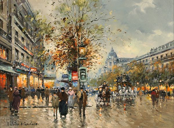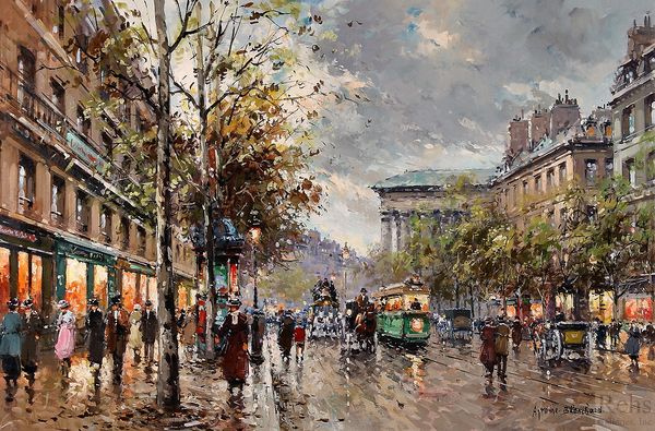 Antoine Blanchard, born in 1910, painted this view of Place de la Madeleine, capturing a romantic vision of Parisian street life. Blanchard's work presents a world of elegance and leisure, reflecting a fascination with the Belle Époque era and its nostalgia. The painting evokes the socio-economic contrasts inherent in Parisian society. Blanchard, though painting in the mid-20th century, looked back to an earlier time. He captured the stylish bourgeoisie strolling along the grand boulevards. Yet, the quick brushstrokes and diffused light hint at the fleeting nature of such idealized visions. The flower cart in the foreground introduces a note of commerce amidst the leisurely scene, suggesting the labor and class divisions beneath the surface. Blanchard's paintings, while seemingly straightforward, invite us to consider how urban spaces reflect the complexities of human experience and memory, revealing the passage of time. It's a tableau of longing, reminding us that the past is always a constructed and idealized vision.