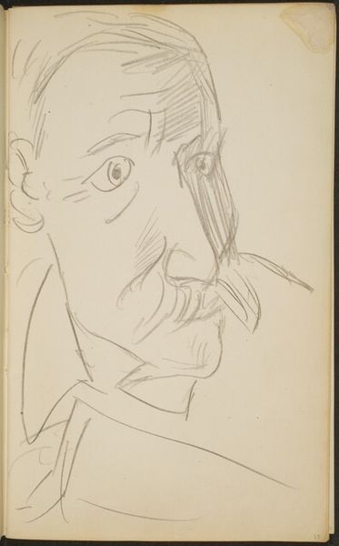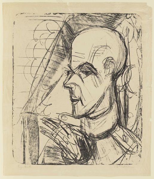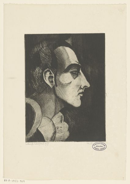 Editor: We're looking at Erich Heckel’s 1920 ink print, "Portrait of E.G." It's a striking image. I'm really drawn to the angularity of the lines and the stark contrast. It’s incredibly direct, almost unsettling. What do you see in this piece? Curator: Formally, I’m intrigued by the dynamic interplay of line and negative space. Note how the sharply defined contour of the subject’s face is juxtaposed with the more gestural, almost frenetic marks defining the surrounding space. The artist employs a strategic disjunction, fracturing the pictorial plane and unsettling any singular reading. What do you make of the relationship between the figure and ground? Editor: That makes me think about how the background isn't just 'background'. The strokes feel really deliberate and they give the portrait such an anxious energy. Do you think the dark and light contrast is important for setting a mood? Curator: Absolutely. The chromatic austerity of the black ink against the white ground amplifies the expressive intensity. Consider the psychological weight conveyed through the distortion of form – the elongated features, the almost mask-like quality of the face. Does this departure from naturalistic representation suggest a deeper exploration of inner states? Editor: I can see that. It’s interesting how he doesn’t seem to aim for an objective likeness but maybe aims to present the sitter’s feelings and thoughts. It definitely gives me a lot to think about! Curator: Precisely. The print’s structural elements, combined with its stark emotive power, offer a powerful testament to the capabilities of expressionist portraiture. I, too, find new details upon each encounter.