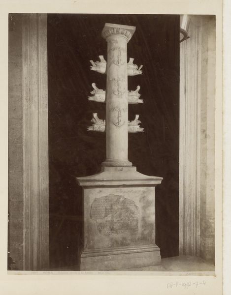 Eugène Atget made this photograph, titled "Bosquet de la Colonnade, les vasques," using the albumen silver print process. The composition emphasizes a play of architectural forms: massive columns frame a curved colonnade receding into space. Light and shadow accentuate the textures of stone and foliage, casting a melancholic mood. The fountain’s ornate carvings contrast with the plain surfaces of the columns, creating a visual tension. Atget's formal approach captures a sense of timelessness, reducing the scene to its basic structural elements. The photograph destabilizes traditional notions of perspective by flattening the space. In doing so, it invites contemplation on absence and the ephemeral nature of beauty. The photograph operates as a sign, referencing the grand designs of a bygone era while simultaneously questioning their relevance in the modern world. The structural composition, with its repetitive columns and arches, not only frames the space but also invites ongoing interpretation.
