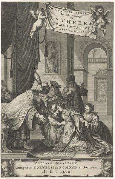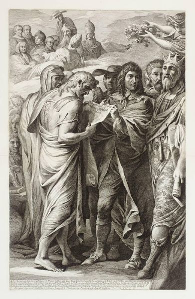 Robert van Audenaerde created this print, "Marriage of the Virgin," sometime between 1663 and 1743. The scene depicts the betrothal of Mary and Joseph, a key moment in Christian theology and a popular subject in art history. Audenaerde's image exists within a long history of representing women in marriage as symbols of purity and devotion, yet it also reflects the social and political context of his time. How does Mary's demure pose and downcast gaze speak to the expectations placed on women in 17th and 18th century European society? Notice the high priest officiating, and consider the power dynamics at play in this sacred union. The surrounding figures and the temple backdrop subtly emphasize the communal and religious significance of marriage. This print invites us to reflect on the historical and cultural constructs that shape our understanding of gender, religion, and relationships. It prompts us to question how traditional narratives can be both upheld and challenged through art.
