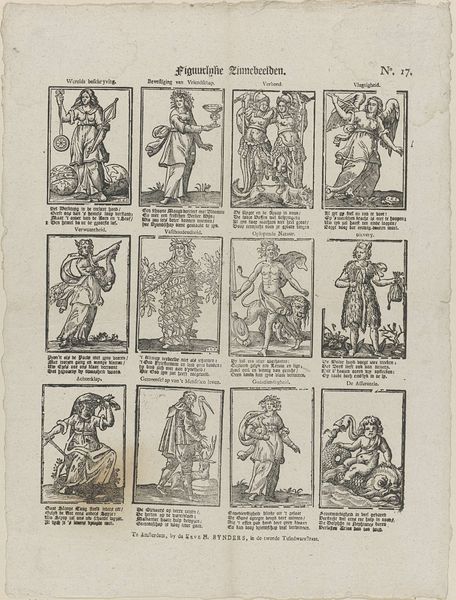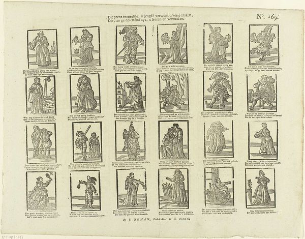 This print, "Hier zyn by een gesteld de afdeeling van 't verstand, tot leering voor de jeugt, en tot vermaak geplant," was created by Johan Noman in the Netherlands. The print is a visual compendium intended to educate and entertain young audiences, offering a glimpse into the values and aesthetics of the time. The collection of images invites us to consider how societal roles and knowledge were conveyed. The images are archetypes of people with different attributes and from different walks of life. Johan Noman presents a range of characters and stories from classical mythology to more contemporary figures. Through its organization and symbolism, the print served as a tool for shaping identity and instilling cultural values in its young audience. It prompts us to reflect on the enduring power of images to educate, inspire, and shape our understanding of the world. The intersection of learning and amusement, is deeply intertwined with questions of power, knowledge, and cultural transmission.