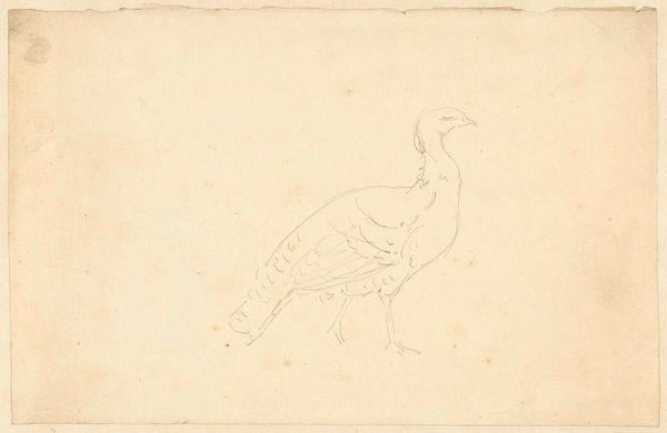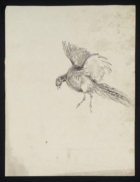 Editor: This small sketch of a pheasant, created by an unknown artist from the British School, is just lovely. The bird seems poised, ready to dart away. What captures your imagination about this simple drawing? Curator: For me, it's the immediacy. You can almost feel the artist's hand moving across the paper, capturing the essence of the bird in a few quick strokes. It reminds me of childhood, of trying to quickly sketch fleeting moments, pure instinct. Doesn't it make you want to grab a pencil and try to capture the world around you? Editor: It really does! I appreciate how the artist prioritizes gesture over detail. Curator: Precisely. And the unknown nature of the artist adds a layer of mystery. It invites us to project our own stories and interpretations onto the image. Editor: I agree. It’s a reminder that art isn't just about the famous names; it's about the beauty and expression anyone can create. Curator: Exactly! It’s about the quiet moments of observation and the simple joy of putting pencil to paper.