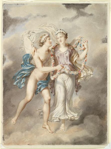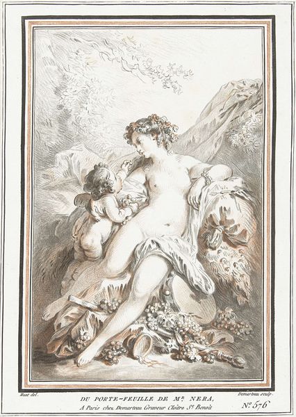 Curator: This is François Boucher’s "Jupiter and Callisto," an oil painting completed in 1744. Editor: It's like a pink and blue daydream. Almost saccharine, but there's an undercurrent of something else, something… knowing? Curator: The painting illustrates a scene from Ovid’s Metamorphoses. We see Jupiter, disguised as Diana, seducing the nymph Callisto. Consider the social context of its production. Boucher was deeply embedded in the court of Louis XV, catering to a wealthy, pleasure-seeking elite. This determined the painting's purpose. Editor: You see all that, and I just see rosy cheeks and frolicking cherubs dangling like ornaments from a very accommodating tree. The way Boucher uses light, it's almost edible, isn't it? The softness everywhere makes it so inviting; yet those dark areas… Curator: Ah, yes. The dark areas—notice how Boucher uses them strategically to highlight the sensuality of the scene. He deliberately creates that tension between lightness and shadow. Now, look at the cupid at the bottom right, and the tools and dead fowl at the base – Jupiter has seemingly abandoned his hunting for a softer conquest. This work isn't just about presenting beauty; it's about the consumption of beauty, packaged and presented for the discerning gaze of its wealthy patrons. Editor: You always bring it back to the stuff, don’t you? Still, it is fascinating how he balances overt symbolism with such lightheartedness. And yes, the little cherubs hanging from the trees - too darling, but wonderfully done. Curator: Indeed, the Rococo style flourished on such delightful, complex contrasts, simultaneously opulent and frivolous. Boucher delivered the materials his audience enjoyed the most, and also was mindful about how his pieces could speak about society at the time. Editor: Well, I can say that gazing at all these soft bodies does make me feel I understand the times they were trying to convey. It has a delightful effect even on a weathered soul like me. Thanks, Boucher, for being so good at crafting candy floss art!