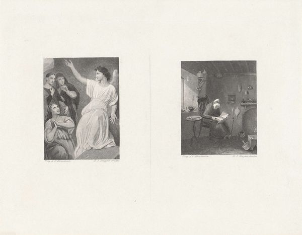 Curator: We're looking at a print titled "Oude man met kind - Weldoenster der armen," dating from between 1842 and 1873, by Dirk Jurriaan Sluyter. Editor: My initial impression is of contrasting scenes – one domestic, warm even, and the other… stark, almost pleading. Curator: Yes, it's interesting how Sluyter presents two seemingly disparate narratives. The left panel portrays an intimate moment: an older man with a child. The right shows a woman surrounded by a group of people, presumably those she helps, hence, Weldoenster der armen or Benefactress of the Poor. These images evoke notions about social structures in the Romanticism movement. Editor: It’s the texture, created by the pens and printmaking processes, that really grabs me. You can almost feel the weight of the garments, the worn surfaces around the figures. These textures enhance the narratives, highlighting the different experiences represented: the comfort of home versus the hardship suggested on the right. The means of creating these different moods feel tangible. Curator: It’s hard to separate that feeling of social obligation present in the title, from the context in which Sluyter made the work. Looking at art production and its relationship to society reveals interesting social power dynamics; artistic production provided images that propagated notions of duty and assistance among upper classes in European societies. Editor: It makes me think about accessibility too. Prints made images widely available; they moved art away from elite galleries and opened new conversations. How were Sluyter’s pieces consumed? Did people consider its means for replication? Was it widely reproduced as well? Curator: Precisely. This piece makes us ask questions about our own engagements, doesn't it? Are we truly seeing, feeling, or just passing through the experience without connecting the image to how we address socioeconomic problems in our era. Editor: Absolutely, and appreciating how the material processes, the artistic production can reflect how social duties get materialized. A beautiful piece overall.