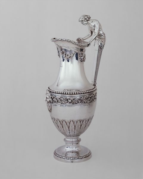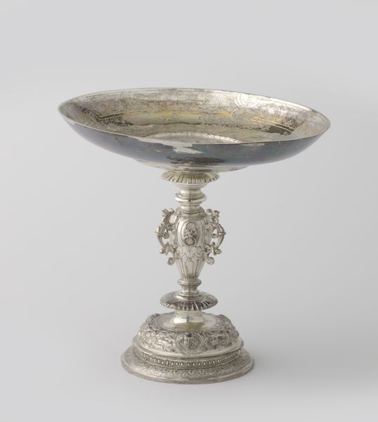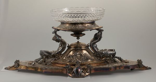 Curator: Oh, isn’t it magnificent? Just look at this Minton’s centerpiece—a true marvel of decorative art, dating back to 1866. Editor: It does strike me as somewhat… stern. It's elegant, yes, and clearly masterfully crafted, but something about that monochrome palette and rigid form feels imposing. Like a ceremonial object, meant for display more than use. Curator: Precisely! Think about its purpose. This isn't just any dish; it's a sculptural declaration. Notice how porcelain elevates the everyday. The blue and white coloration isn’t a bug; it’s a sophisticated feature! Editor: True. Blue and white always speaks of timelessness, evoking ancient pottery traditions, even if subconsciously. And those figures adorning it—they look distinctly Roman. All in that restrained palette… It's a very intellectual take on luxury, really. Curator: Definitely a conversation starter. These images act like tiny portals. I’m captivated by the way Minton integrated historical motifs – what stories they hint at and echo down through the years! Those warriors! The way those ceramic heads pop from the base! You begin to construct stories about power, intellect and virtue – perfect for displaying fruit! Editor: Or reminding your dinner guests of their place in the pecking order! But more seriously, yes, I can see that too. I mean, an object like this becomes a carrier of cultural memory itself. These symbols—warriors, classical heads—become vessels. Even their arrangement carries significance; It gives the entire sculpture an austere visual rhetoric, fit for a proper English banquet. Curator: A sentiment made manifest in porcelain and ceramic. It makes me think of banquets long past, of empires built and fallen, and the enduring human desire to create beauty, even amid all that turmoil. Editor: So, perhaps it’s less about austerity and more about... enduring strength? Either way, it’s hard to look away from that central cup at the very top, which stands to command. It is a real statement piece. Curator: Exactly. Next time you see one of those kinds of warrior faces, or similar arrangements of colors, perhaps this memory can speak into that moment.