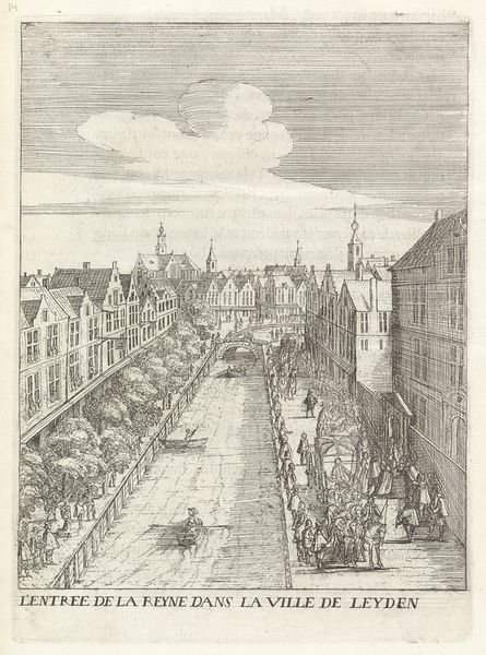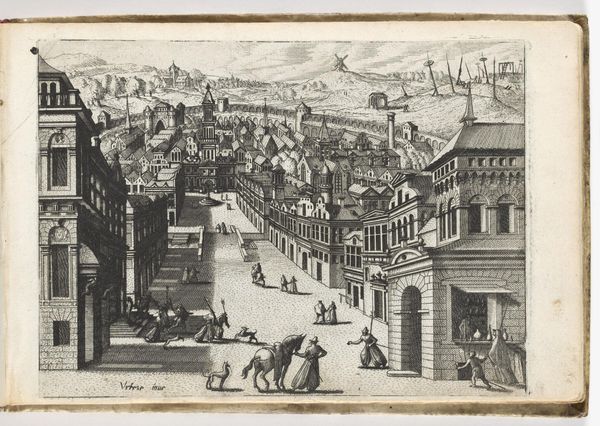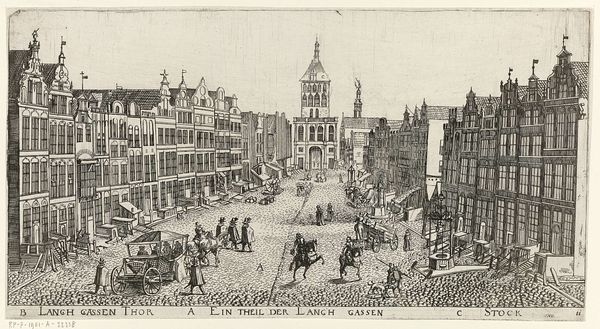 Editor: This etching, "Gezicht op de houtmarkt in Danzig" or "View of the wood market in Danzig," by Aegidius Dickmann, dates back to 1625. I’m struck by how much is happening. It really captures a sense of everyday life, the architecture, the commerce... What do you see in this piece, beyond the obvious? Curator: Beyond the depiction of a bustling marketplace, I see a portrait of labor and the built environment intertwined. Consider how the wood market itself, and the very act of portraying it, depends on systems of resource extraction and economic exchange. This isn't just a snapshot; it’s an insight into the urban fabric sustained by both human and natural resources. Do you see any indicators of social stratification within the composition? Editor: Well, I notice that people are working, and some seem to be directing that work. Does the positioning of the 'Holtz Marckt,' labeled 'A' relative to the 'Brotegassen Thor', labelled 'B', affect how we view that society's economy? Curator: Absolutely. The very layout subtly emphasizes control and access. Ask yourself, who has access to the wood, and who profits most directly? Look closer at the clothing and activities depicted; where do you see potential indications of hierarchies being reinforced? This relates to historical perspectives about trade dominance of states and subjugated groups being exploited for their raw goods. Editor: I guess I didn't fully appreciate that the artist isn't merely showing a scene but making a commentary on resource control and potentially, on unequal labor dynamics, too. Curator: Precisely. Art provides us with opportunities to view complex socio-economic dynamics that shape people's lives. It's all about unearthing the hidden narratives, don't you think? Editor: Definitely, I'll never look at a cityscape quite the same way. Thank you!