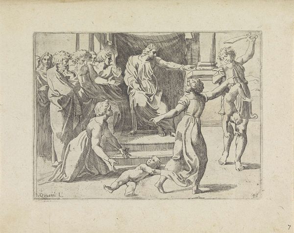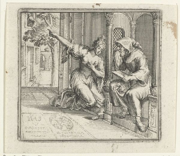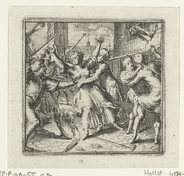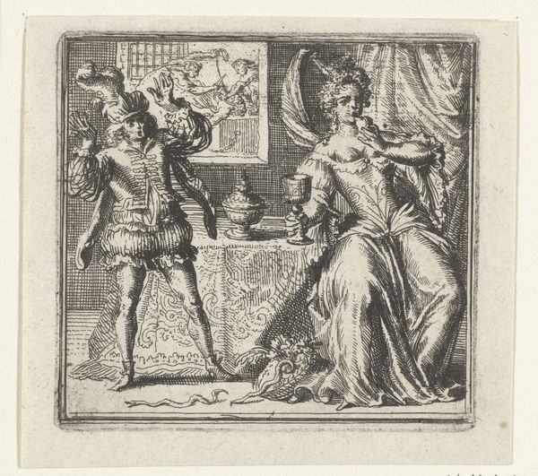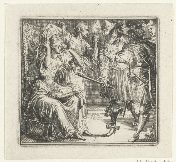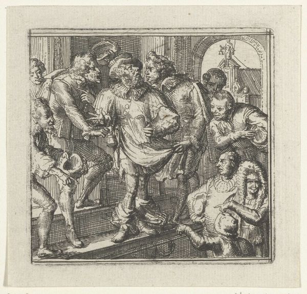 Curator: This is an illustration for Boccaccio's "Decameron," created by Romeyn de Hooghe in 1697. It's currently housed here at the Rijksmuseum. What’s your initial reaction to it? Editor: My first thought? It's wonderfully theatrical! Like a tiny stage crammed with players caught in a moment of high drama... but with slightly confused expressions. And is that dueling going on outside the window? Curator: It could be. This print really encapsulates the energy of De Hooghe’s time. Consider how he uses that backdrop – it suggests a world beyond the immediate scene, and those dueling figures might echo the themes within Boccaccio's tales, like conflict or competition. Editor: It adds to the chaotic energy. Look at the figures: the textures created by the linework evoke rich fabrics and elaborate gestures. The scene has an old engraving feel like something I would find within an antique collection or personal sketchbook. What I love is how suggestive it all is; leaving you, as the viewer, space to interpret the narrative. What story do you think this depicts from the Decameron? Curator: Identifying a precise tale can be tricky. However, consider that the "Decameron" delves into themes of love, deception, wit, and fortune, all set against the backdrop of the Black Death. De Hooghe likely selected elements that capture these broader themes, rather than illustrating one specific narrative. I see repeated visual ideas representing personal values across cultures throughout his era. Editor: I find myself wanting to rewrite the dialogues of the people we see within this artwork and it reminds me how we continuously remake and remold history itself! Is there a cultural takeaway we can glean here? Curator: The artwork demonstrates a timeless interest in tales exploring fundamental aspects of being human that has remained popular throughout history and across different forms of art. De Hooghe is showing how culture creates art that shapes the viewer's cultural background. Editor: The beautiful cyclical interpretation brings a complete yet open conclusion to this artwork! Thank you for joining me.