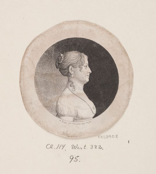 Curator: I find this image captivating. The lithograph on toned paper depicts Anne Margrethe Schall, an 18th-19th century figure, as captured by Andreas Flint. The piece resides here at the SMK. Editor: Immediately, I’m struck by its almost austere, neoclassical feel. The circular format, the profile view... there's a restraint but also a depth in the shading that gives it life. Curator: The choice of lithography allows for such fine detail. Looking at Flint's process, we can see the influence of contemporary printmaking, with an interesting attention to replicating the effects of earlier engraving styles using new methods. The paper choice, its texture and tone, contributes significantly to the final affect, something to consider for viewers reflecting on craft processes here. Editor: Absolutely. The profile portrait itself carries specific cultural weight, hearkening back to ancient coins and classical portraiture, which implies power, nobility, or lasting importance. Note how the necklace and earrings signal wealth and status, visual indicators read across generations, but also softened with that elegantly draped cloth to reveal more of a personal warmth. Curator: The way light is handled, creating soft shadows and highlights on her face, also speaks to prevailing tastes. This wasn’t a quick sketch, I believe, but a deliberate and careful construction utilizing new technology for greater availability, signaling perhaps an increased role for middle-class or upper middle class consumers and models in the marketplace for portraiture? Editor: That’s an interesting thought – it also might play into shifting ideals around womanhood during that period. We see hints of revolutionary fervor translated here into art and domestic life...her serious, almost defiant, gaze projecting intellectual and cultural values beyond domestic concerns. Curator: This piece prompts interesting thoughts around process and influence, especially the intersection of technical means and social function within an individual object. Editor: For me, this portrait continues to offer subtle glimpses into a bygone era through an ever shifting visual code, inviting further conversation long after one leaves the gallery.