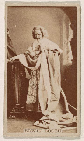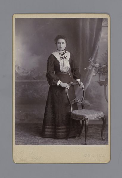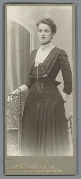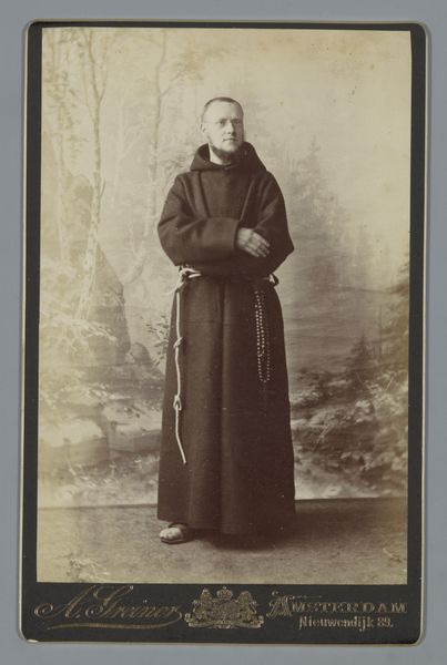 Curator: This gelatin-silver print captures "Portret van kardinaal Johannes de Jong," sometime between 1900 and 1955. It's quite striking. Editor: My first impression is of a weighty presence – both in the cardinal's expression and in the sheer volume of fabric. The folds of his cape practically narrate a story of labor and artistry all their own. Curator: Yes, there's a certain gravity. The lace, the heavy cloth, it speaks of craftsmanship and also perhaps of...the weight of expectation? What kind of material analysis does it lend itself to, do you think? Editor: Oh, immediately I start wondering about the lacemakers, who spent countless hours on that incredibly intricate detail. What were their working conditions? Who got paid what for making vestments versus, say, undergarments? These objects always point to much broader production networks. The choice of gelatin-silver print also signifies something of an industrial-era process being used to document a high ranking member of the church, a cultural intersection that bears thinking about. Curator: Absolutely. It makes you think about the power structures embedded within seemingly simple things, right? His calm expression almost hides it but that pose is doing a lot of work to convey dignity and... what, stability? Is it convincing, though? Editor: Convincing maybe isn't the word I'd use... It's constructed. From the studio backdrop suggesting an imposing architecture, to that carpet fragment creating instant, artificial grandeur. Each choice signals authority, but in such an overt manner it risks revealing more than it conceals, don’t you think? Curator: I do. Maybe he was more than just a figure of authority to his people, the church. But these were times where portraying authority meant more than honesty or true portraiture. Editor: Precisely, and seeing these layers exposed through something like photographic processes forces you to question everything about the image-making enterprise itself at this time. It gives insight on the industrial scale creation of objects as representations of status, authority, even holiness. It is truly the power of clothing. Curator: I think I see it with renewed eyes now. Let's go on to our next work of art.