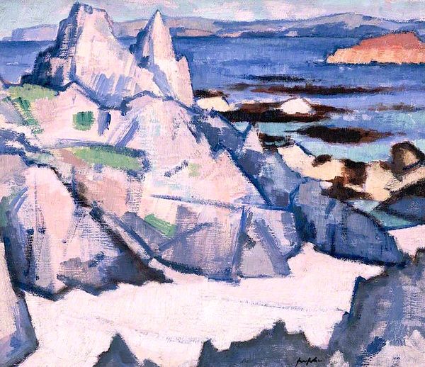 Editor: This is "Iona," a 1923 oil painting by Samuel Peploe. There’s a real stillness to this landscape, despite the broken brushstrokes. What social currents might have influenced Peploe’s rendering of this remote Scottish island? Curator: That stillness, as you call it, is deceptive. Look closer. Iona wasn't just a pretty view; it was, and remains, a site steeped in history and spirituality, deeply connected to Scottish and Celtic identity. Consider the early 20th century: Scotland was grappling with questions of national identity amidst the decline of the British Empire. Could Peploe’s choice to depict Iona be interpreted as a conscious act of claiming a visual space for Scottish culture, perhaps even subtly resisting dominant English narratives? Editor: I hadn't considered it as a statement of identity. So, the seemingly peaceful landscape might be concealing something more profound? Curator: Precisely. And think about the rise of Modernism at the time. Artists were moving away from purely representational art, exploring subjective experiences. How might Peploe's use of bold color and flattened perspective be interpreted as a way of expressing a personal connection to the land, one that transcends mere picturesque scenery? It almost borders on abstraction, right? Editor: Yes, especially with those simplified forms of the rocks and water. So he is perhaps presenting his *own* view? Curator: Exactly! And the intense colors... Could those be expressing something about the emotional or spiritual significance he finds there, something that resonates with the history of the island? In a way, he's staking a claim – artistically and culturally. The act of "plein air" painting becomes performative. What are your thoughts on this approach? Editor: That's a really compelling point. I will now always see more than pretty blues and whites. Curator: It enriches how we all see the work!