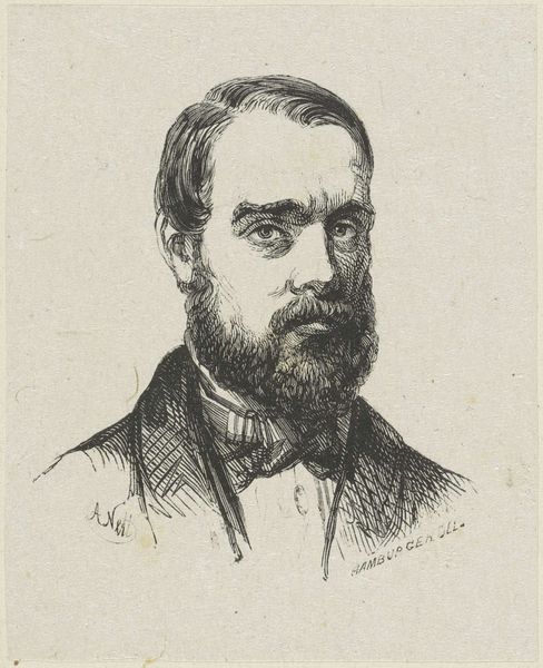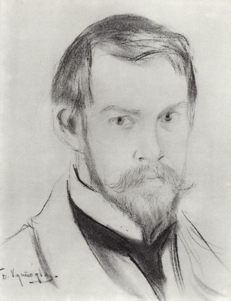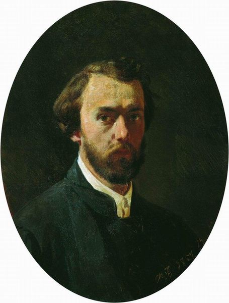 Editor: Here we have Ilya Repin's "Portrait of writer Vladimir Grigorievich Chertkov," painted in 1890 using oil. The oval composition gives it a formal, almost classical feel, but there's a certain raw quality to the brushwork and a contemplative mood. What strikes you about this painting? Curator: Its formal qualities are immediately apparent. Observe the painterly application; each brushstroke functions almost independently, yet contributes to the cohesive image. The restricted palette - earthen tones modulated by highlights - enhances the sitter's introspective gaze. How do you read the relationship between the figure and the ground? Editor: I see the background as more blurred and less defined, placing more emphasis on the individual in the foreground. But it's an unusual composition. Repin usually works in a realist style, this appears somewhat unfinished. Curator: Indeed, it flirts with the unresolved, resisting the polished finish of academic portraiture. This perhaps directs us toward a deeper engagement with the internal world of the sitter, rather than mere external representation. Notice how the limited color range directs us back to the central themes of form and its manipulation. Editor: That makes sense. The slightly undone quality almost adds to the feeling of thought, like we're catching Chertkov in a moment of reflection. The limited color palette helps the image as a whole. I’d assumed it was simply part of the Russian realist style, but there seems to be an intriguing complexity at work. Curator: Precisely. And in doing so, the painting performs more than simply portraying the sitter; it enacts, perhaps even embodies, the very process of thought itself. Editor: That’s given me a lot to think about! I'm finding new ways to approach realism beyond simply a depiction of real life.
