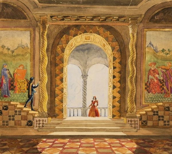 Curator: Here we have Petre Otskheli's 1936 drawing, "Sketch for 'Winged Painter'". It's executed in ink on paper. What strikes you about it? Editor: Initially, I find the composition unsettling. There’s a tension between the classical architectural elements and the almost dreamlike figures. The somber colors reinforce that sense of unease, doesn't it? Curator: Indeed. Otskheli was working during a period of intense political upheaval in the Soviet Union. His work often subtly critiques the grand, monumental style favored by Stalinist architecture through surrealism and the grotesque. Editor: You can certainly see that critique emerging through these almost ghostly figures lining the staircase. Are they caryatids? They feel both supportive and suffocating at the same time, mirroring a state trying to support but in fact restricting artistic freedom. And what about the flowers the figure in the foreground holds? Is that an offering, a sign of compliance, or perhaps a symbol of fragile beauty within a brutal regime? Curator: Interesting observation. These bouquets can also symbolize the individual's fading autonomy and desire to conform when faced with state-sponsored control of public spaces and creative endeavors. Otskheli experienced significant pressure from Soviet authorities, who viewed many avant-garde styles with suspicion. This can even be seen as a modern cityscape portrait— a genre Otskheli worked in—expressing something important that needs deciphering through semiotics and the use of the visual lexicon from the past to create tension and discussion in the contemporary public. Editor: Right, the pressure for artists to conform during that time was immense. This artwork resonates beyond its immediate historical context, doesn’t it? The question of artistic integrity versus external demands, it's a struggle that remains relevant today. It's the politics of display that we need to always consider, the state-approved, or "curated", artwork with agendas versus subversive commentary from those that disagree. Curator: I completely agree. Otskheli’s sketch serves as a powerful reminder of art's capacity to embody complex social and political anxieties, turning the public spaces of creative work and consumption into a theater of socio-political negotiation. Editor: Yes, and it demonstrates how even a preliminary drawing can provoke critical inquiry into issues of freedom, expression, and societal control.