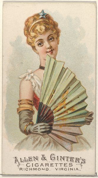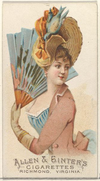 Curator: This small print, "Plate 48, from the Fans of the Period series," was created in 1889 for Allen & Ginter Cigarettes. It is a miniature portrait, composed of colored pencil and print work. Editor: The immediate impression is one of delicate artifice. The composition feels deliberately staged, from the wistful gaze to the carefully positioned fan and the exuberant hat. It’s undeniably charming. Curator: Absolutely, there's a definite artifice, meant to evoke a specific cultural fantasy, linking the consumption of cigarettes with an air of sophistication and international flair. Consider the Japonisme influence, for example. Editor: Yes, the fan reads as a clear visual cue there, doesn’t it? In terms of the construction itself, notice how the relatively flat planes of color emphasize form and line over depth or texture. Curator: That stylistic flattening definitely underscores the "fancy picture" element, elevating an idealized feminine beauty and associating it with a lifestyle that the consumers of the product were encouraged to identify with, thereby transferring the symbol value into social capital for consumers. Editor: The artist’s application of colored pencil mimics the subtle gradations and blended effects of a traditional painting, all the while conforming to the constraints of a mass-produced print. It is really remarkable, technically. Curator: What’s interesting, too, is the condensation of a type—she’s not merely a pretty face but a stand-in for an aspirational class identity, circulated and consumed widely. You hold a symbol; therefore you possess a type of power or understanding that relates to it. The commercial transaction creates cultural continuity through distributed desire. Editor: So the appeal is that of controlled luxury, then. Though humble in scale, it clearly functions to associate the brand with sophistication and an accessible yet still "high society" aesthetic. Thank you for walking me through that; I can appreciate that more now. Curator: And I thank you, I tend to get lost in the symbolic translation that these items created. You bring me back to appreciating the actual composition, which is easy to overlook given how entrenched these images became.