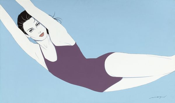 Editor: Here we have Patrick Nagel’s “Nude on Back with Black Stockings,” from 1983, made with acrylic paint. The stark, geometric shapes give it such a cool, detached mood. What catches your eye in terms of the composition? Curator: Observe how Nagel manipulates the interplay between positive and negative space. The stark white of the figure against the solid purple backdrop creates an immediate visual tension, drawing the eye along the elongated, curving lines of the body. He flattens the figure, reducing it to essential forms. Editor: It almost feels like a graphic design, a striking image but… sort of distant? Curator: Precisely. Note the reduction of detail, particularly in the face. This abstraction removes individuality, transforming the figure into an archetype. Consider how the high-contrast color palette - the sharp blacks, blues, and whites – further contributes to this sense of cool detachment, highlighting the surface and denying depth. The line becomes paramount, defining form and contour. Editor: So the impact relies more on these shapes and lines than any emotion from the figure? Curator: Precisely. The formal elements eclipse any sense of conventional sensuality. Nagel presents a stylized ideal rather than an emotive portrayal. Think about the strategic placement of light and shadow – they accentuate the geometry of the pose, reinforcing the image’s graphic quality. Does that read as modern to you? Editor: Yes, definitely. I never would have picked up on so many layers of design thinking. Thanks! Curator: A careful consideration of form always reveals more than initially meets the eye.
