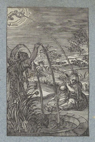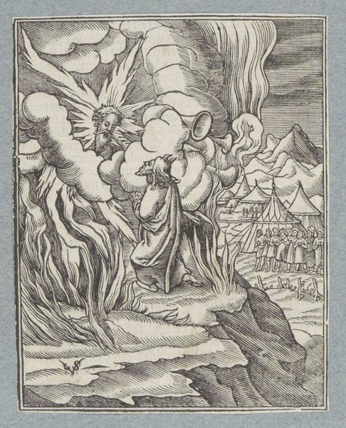Christoffel van Sichem II created this woodcut, "Angel with Mask and Lightning Scaring a Child," sometime before his death in 1658. During the Baroque era, the intersection of religion and daily life meant that many were taught to fear divine retribution. Here, Sichem powerfully visualizes the fear of God. Instead of a benevolent figure, the angel has a frightening, mask-like face and wields lightning bolts. This menacing figure descends upon a child who cowers, overwhelmed by a sense of their own vulnerability. The dramatic sky and stark contrast between light and shadow amplify the scene's emotional intensity. Sichem uses the angel to convey the all-powerful and sometimes wrathful nature of the divine. This image reflects a society grappling with questions of faith, morality, and the human condition amidst the backdrop of religious and political upheaval. Sichem captures a raw, human emotion. The woodcut serves as a reminder of the psychological power that religious imagery held.