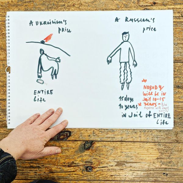 Alevtyna Kakhidze made this drawing with what looks like a felt tip pen on paper. The directness of the line reminds me of a lot of art brut or naive art. The simplicity of the materials really lets the message shine through. On the left a figure asks, "Why do you Ukrainians not surrender?", and on the right, in response, two people are passing a book that says "History" and "Russia did not win all wars". There's something so touching about that, like, "Oh, you wanna know why? Here's why." I mean, the book looks really heavy, but they're sharing it anyway. What I also like is that the drawing really just wants to communicate something, and in doing so, it transcends the simple materials used to make it, just like art is supposed to do. Maybe Kakhidze was inspired by someone like Jessyca Loewe, who makes similarly unpretentious work, that packs an emotional punch.