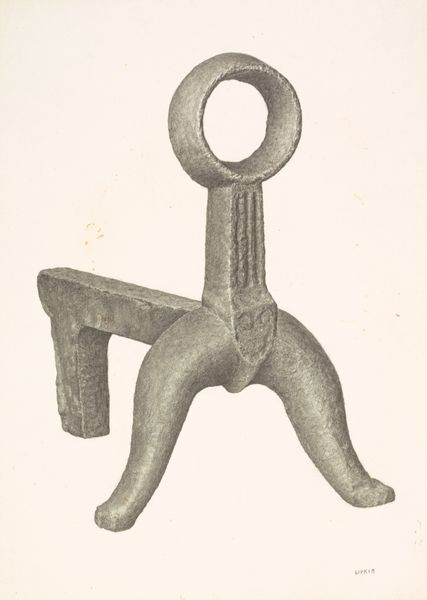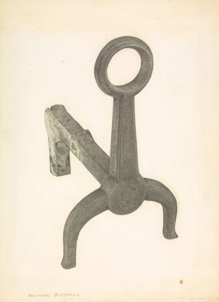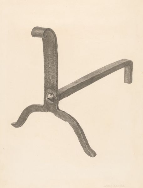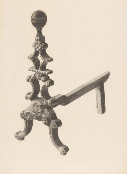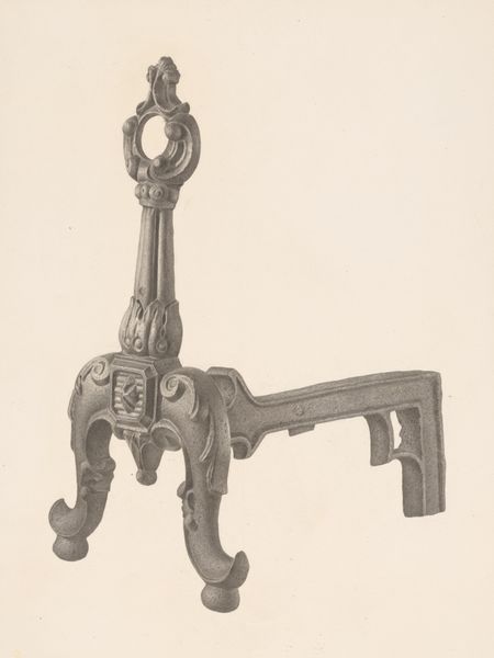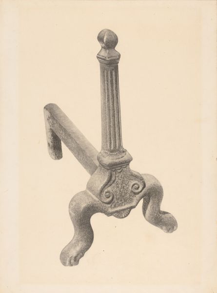 Curator: It looks solid, utilitarian, and even a little austere. I feel like I should be adding logs to a fireplace! Editor: We’re looking at “Andiron (one of pair),” a drawing rendered around 1938 by Jack Staloff. It’s crafted with graphite and pencil on paper. What strikes you about its construction, beyond the immediate visual impression? Curator: The dedication to detail using such commonplace materials is surprising. Look at the variation in the graphite, suggesting texture and wear on the metal. The contrast makes this utilitarian object worthy of display, removed from its usual function, the labor involved seems important. Editor: Exactly. And what's compelling is that Staloff has transformed what would normally be a mass-produced object—a functional andiron, intended for domestic use—into an object of artistic contemplation. This piece enters into dialogue with similar artworks funded through New Deal programs, art that questions the values of craft within industrialized settings. Do you get a sense of that? Curator: I see it now. The emphasis isn’t solely on aesthetic value; the drawing highlights the role of manufacture. It suggests a critique of the relationship between design, industrial production, and labor during the Depression era. Editor: Right. Furthermore, think about how institutions, particularly museums supported by New Deal programs, influenced this type of artistic production. By showcasing commonplace items, these institutions elevated them and redefined their social and cultural importance. Curator: So, we’re not just admiring a drawing of an andiron, we’re also examining how art shapes public perception. We’re reflecting on value in times of hardship and change. Editor: Precisely. And in a way, this simple andiron—or rather, Staloff's thoughtful depiction of it— becomes a small monument to those economic shifts and to the evolving role of art within society. Curator: It changes how I see drawings – it highlights its potential as commentary on daily life and social value. Editor: Yes, it pushes beyond a simple image to prompt historical consideration of industry and cultural memory.