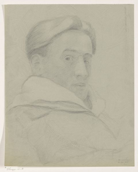 Editor: Here we have Cor van Teeseling's "Zelfportret: B-1-1, 3 februari," possibly from 1942, a self-portrait done in pencil. The fragility of the lines gives it a sense of vulnerability, almost like a ghost. What do you see in this piece? Curator: It's precisely that sense of temporal and emotional fragility that resonates. Knowing this was potentially created in 1942 invites us to consider the socio-political context of the Netherlands during World War II. Was van Teeseling's artistic production restricted? Did materials become scarce? The deliberate choice of pencil, a readily available and unassuming medium, could itself be a form of quiet resistance or adaptation under duress. How might the act of self-representation serve as a means of preserving identity when external forces sought to erase it? Editor: That's a powerful thought. The simplicity could be a statement in itself. I hadn’t considered it in light of resource limitations, either, and yet that makes so much sense. Could the date inscribed be important? Curator: Absolutely. Specific dates can operate as silent witnesses, subtly defying the obliterating force of history. Does "B-1-1" have meaning in archival records? If he produced several of these, that number is probably an identifier, but one we cannot assess easily without deeper research. We can interpret how van Teeseling inserts his individual existence into a larger narrative during times that individuality was in jeopardy. Editor: So, beyond being a portrait, it's also a record of a specific time and maybe a form of personal and political resistance? Curator: Precisely. It's a potent reminder that art serves a vital purpose: documenting history, both publicly and privately. Editor: I’ll definitely be looking at art of this period differently from now on. Thanks for the context. Curator: My pleasure. Recognizing these social contexts enables us to unlock a deeper significance to art as social and political witness.