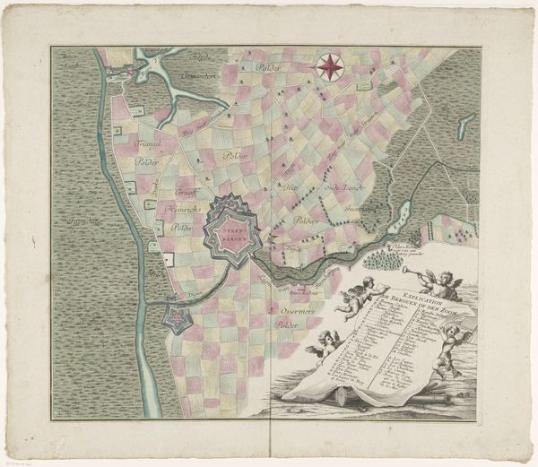 Editor: So, here we have an anonymous 17th-century watercolour illustration entitled "Vestingplattegrond van Libourne," or "Fortification Map of Libourne" from 1638. The intense pink colour dominating the centre is really striking. How do you interpret this work? Curator: That pink, for me, speaks volumes. Beyond mere aesthetics, consider what it represents within the context of 17th-century cartography. Maps were instruments of power, used to delineate territory, control populations, and project authority. The vibrant pink—likely artificial, not ‘natural’—could symbolize the coloniser’s imposed vision, transforming the landscape into something easily consumed and controlled. Think about the social implications of depicting a place not as it *is*, but as a tool for those in power. What does this flattening mean for the inhabitants? Editor: That's a really interesting point. It's easy to just see it as a pretty picture, but the pink does seem to impose a certain artificiality onto the scene. It’s almost…performative. Do you think that it serves as a kind of… symbolic warning of those boundaries and, potentially, consequences of crossing it? Curator: Precisely! And let’s consider the “fortification” aspect. Who were these fortifications *for*? Who were they keeping *out*? The map is silent on the experiences of those who may have resisted this imposed order. Maps are never neutral; they are always telling a story from a particular viewpoint. Think about the indigenous populations; what might a map *they* created have looked like? Whose stories are being prioritised? Editor: This definitely shifts my perspective. It is more than just a landscape or nice colours, it's about power, control, and who gets to write history – or, in this case, draw the map. Curator: Exactly. Questioning these seemingly objective representations helps us to unravel the complex narratives woven into the very fabric of our understanding of the world. It allows us to understand that landscapes contain historical echoes of identity, gender, race, and politics.