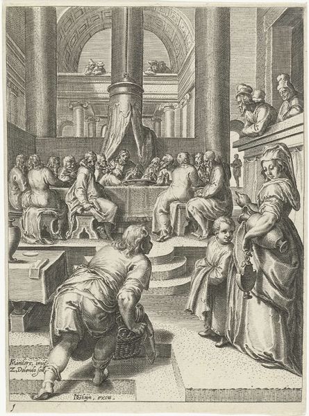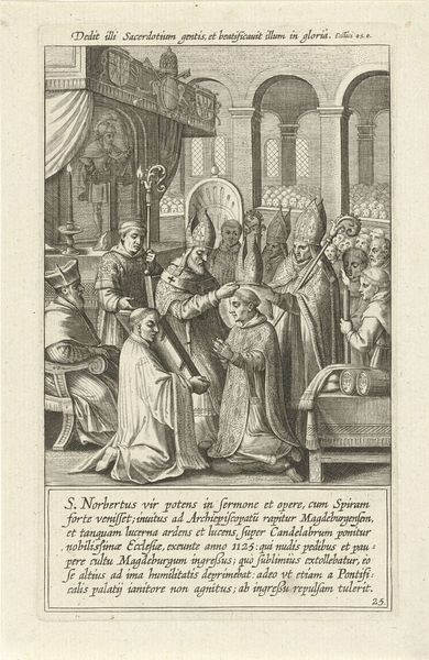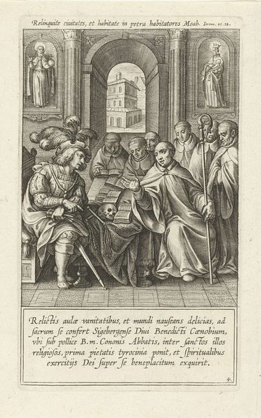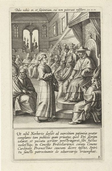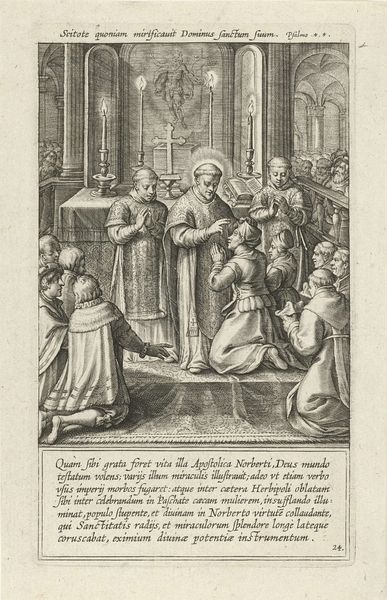 Curator: I'm struck by the tension in this early baroque print. The scene is so meticulously rendered; you can almost feel the weight of the historical moment. Editor: Absolutely, there's a real dramatic presence. All those hatched lines create a striking contrast with the softness of Norbertus’ face. But let's orient listeners. What are we actually looking at? Curator: Of course. This engraving, titled “Moordaanslag op de heilige Norbertus wordt verijdeld”—which translates to "The attempted murder of Saint Norbert is thwarted"—was created in 1622 by Cornelis Galle I. It's currently held at the Rijksmuseum. Editor: Before diving into the art historical reading, my immediate take is how the artist is clearly reveling in this dramatic chiaroscuro. The figures are strongly lit, drawing my attention right to Norbertus and the would-be assassins. You get a strong sense of his power and the threat he faces. I’d love to know how these prints circulated, and what purpose they fulfilled at the time they were produced and disseminated. Curator: Well, if we consider the historical context, this work is a powerful piece of Catholic propaganda. The artist uses a historical narrative, which suggests the saint's power to expose anti-Catholic conspiracies and attempts on the church, particularly amidst the backdrop of the Reformation. Editor: The detail! I mean, look at the different textures achieved solely through line work: the robes, the faces, the furniture. You almost forget you’re dealing with an image made solely through repetitive, linear actions. What about this circulation? Was the labor involved commensurate with its reception? Curator: Indeed. The circulation of these prints would have reinforced the Catholic narrative. Prints were used to teach about Catholic figures and communicate hagiographic concepts across different audiences. The work served to unify Catholic identity amidst sectarianism. Editor: It’s incredible how much narrative and theological content is packed into such a materially simple medium. Cornelis Galle I. really wrung the most impact out of ink on paper. For me, the strength lies in how the material speaks to the political forces behind its creation. Curator: Exactly, this image becomes an example of art deeply embedded within a historical narrative, a story told with moral and ideological weight. Looking closely allows us to trace not just Galle's technical skill, but also his role within a fraught chapter in European history. Editor: Well said. Examining the tangible elements of printmaking has illuminated this moment and underscores how even seemingly simple artworks can become potent agents of cultural narratives and belief systems.