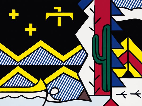 Curator: Here we have Roy Lichtenstein’s "Bicentennial Print," created between 1975 and 1976. It’s a mixed-media print incorporating collage and screenprint techniques. Editor: It’s immediately striking, this organized chaos. It feels both celebratory and disjointed, with those strong lines sectioning off seemingly unrelated images. I'm picking up on a fragmented narrative of American identity. Curator: Lichtenstein was deeply interested in the power of graphic symbols and visual communication. Note the strategic deployment of visual shorthands like a rising sun or a section of greek-style fret, all laden with layered historical resonance, filtered through his signature Pop Art sensibility. Editor: Exactly! The composition almost mimics the chaotic, over-saturated visual landscape of consumer culture. Those standardized geometric abstractions read like capitalist iconography rendered impersonal. And it’s all done in a deliberately flat style; no depth, no perspective. He critiques the American spectacle. Curator: I agree. But Lichtenstein is doing something more subtle, too. Think about the title. It’s commemorative of the Bicentennial, an event dripping with the mythos of the American narrative. But Lichtenstein splinters the mythology through these disparate images. Each symbolizes a piece, but refuses to cohere in a predictable way. Editor: Which reflects the actual experience of a nation founded on contradictions. This print, made nearly 200 years after that founding, doesn't give us a sanitized, celebratory historical painting, does it? This acknowledges the cracks. It shows a deliberately obscured picture of what America actually is. Curator: Lichtenstein presents cultural continuity through discordance. Each component still holds a cultural echo, and through their combination, the cultural image takes a new meaning. His treatment reminds me of a Cubist strategy of fracturing form, opening visual form to multiple simultaneous readings. Editor: Yes. It questions that singular historical narrative and welcomes diverse, potentially conflicting interpretations of what it means to be American in the 1970s, and now, half a century later, this piece keeps questioning what a collective, shared American identity even looks like. Curator: Considering our dialogue, it seems clear the image contains complex iconography to be parsed. I think that the effect will vary, but to some viewers, this is undoubtedly a mirror to their own ideas about nationhood and heritage. Editor: For me, this work reveals how identity—national or otherwise—is always a collage, a constructed, contested space. It’s never complete and it’s always subject to change.