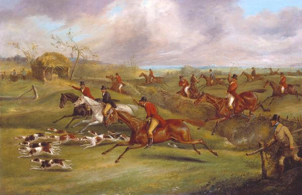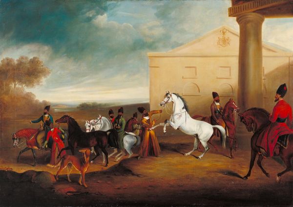 Editor: This is "Cavalcade in front of Heiligenberg Castle Prince Karl Egon II of Fürstenberg and Amalie, b. Princess of Baden," painted by Albrecht Adam in 1831, using oil paint. It’s quite detailed. I'm struck by how this is not only a portrait of aristocracy, but it also features a vast landscape. What aspects of this painting grab your attention? Curator: I'm immediately drawn to the interplay between the landscape and the figures. Consider the relationship between land ownership and artistic patronage in 19th-century Europe. Adam is not simply depicting these figures, he's showcasing their dominion over a landscape, carefully rendered using costly materials. The labor and resources involved in producing a painting of this scale are significant. What can the brushstrokes themselves tell us about the artist’s hand, the materials used? Editor: I see what you mean about “dominion.” The high viewpoint, the way they command the space…Do you think there's any challenge being presented to conventional high art here through the landscape genre itself? Curator: Precisely! Notice how the artist blurs the lines between portraiture and genre painting. Genre scenes were often considered "lower" art, more focused on everyday life. Adam elevates this, by injecting it with the symbolism of aristocratic status. What statement might this imply about the changing social roles of the aristocracy amidst rising industrialization and shifting economic powers? Editor: I guess it makes sense to elevate landscape painting. Because we can directly relate it to wealth. But it does blur the boundary like you said. It kind of merges labour, landscape, material possession into the visual meaning. Curator: Exactly. Adam's choice of oil paints as medium and landscape style also reflects the material conditions of artistic production. Do you feel looking closely at the artist’s working conditions and Adam's process alters your understanding? Editor: It does. Thinking about it from a labour point of view. Thanks, I've got a better understanding now about materials!
