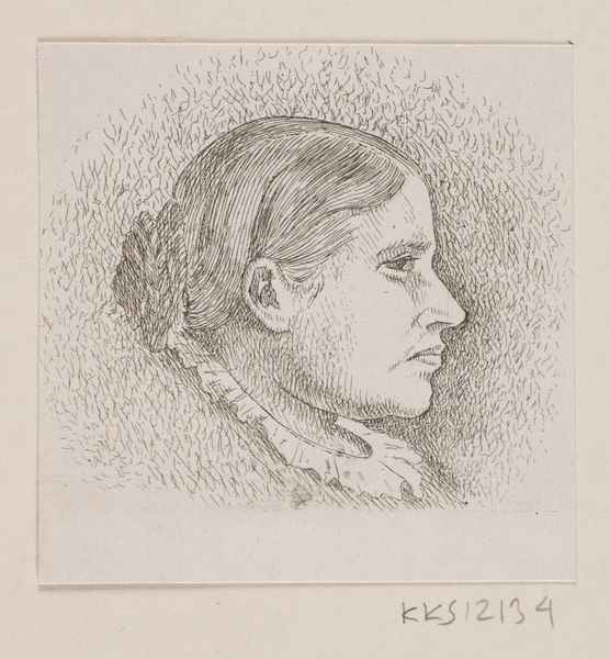 August Allebé created this portrait of a woman using graphite on paper. The artist's confident yet tentative use of graphite allows us to see the process of its making. The pressure and direction of the pencil on paper create a range of tones and textures, from the light, sketchy outlines to the denser shading that models the woman's face. Note also the oval shape containing the figure, and the gestural, searching lines trailing down the paper. These were likely guide marks that reveal the artist's attempt to capture not just a likeness, but also a sense of character and presence. Although drawing appears simple, it requires considerable skill in translating three-dimensional forms onto a flat surface. The way Allebé uses these simple tools and techniques elevates the artwork beyond a mere sketch. The conscious decisions about pressure and direction in mark-making all contribute to the work's aesthetic qualities. This piece reminds us that even in the most straightforward of materials, the artist's hand and process are central to the meaning we derive from the work. It's a powerful example of how craft and fine art can merge.