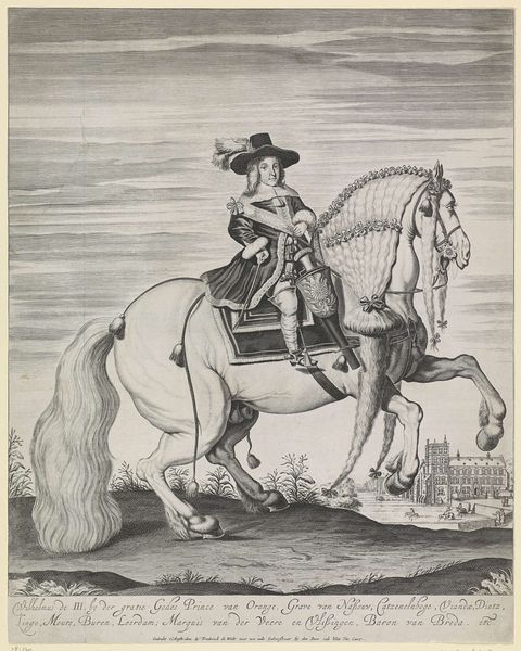 This is ‘Steigerend paard’ by Dirk Maas, an engraving held at the Rijksmuseum. The piece captures a horse rearing up, its front hooves raised, a rider composedly holding the reins. The interplay of light and shadow is striking, giving a sense of dynamic movement to the scene. The composition uses the verticality of the horse’s pose. Maas challenges the conventional equestrian portrait by focusing on a moment of tension and control. This is not a static display of power but a study in controlled energy. The background is softly rendered, suggesting a landscape, but the emphasis remains firmly on the horse and rider, pushing them into the foreground. Through his expert handling of engraving techniques, Maas transforms a conventional subject into a vibrant exploration of form and movement, inviting viewers to reconsider traditional representations of power and grace.