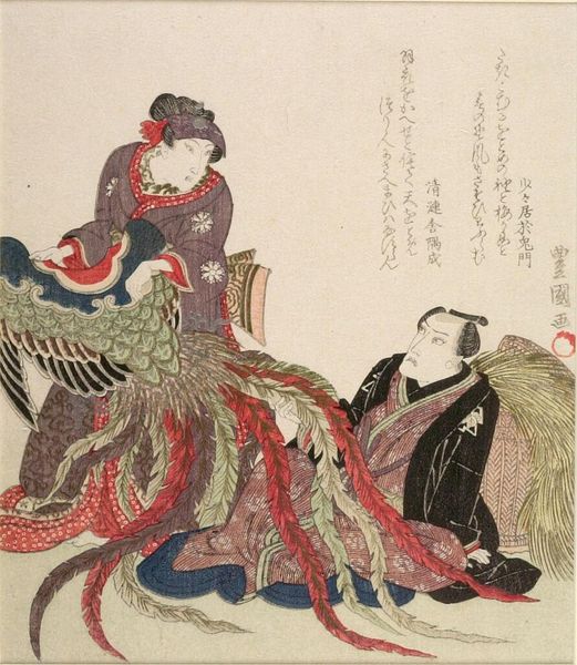 Editor: So, this colorful woodblock print, "Samurai and Monkey," is by Keisai Eisen. I’m really struck by the sort of relaxed, almost comical feel despite the samurai subject. What's your read on this piece? Curator: Isn’t it delightful? Eisen seems to be winking at us. The plum blossoms, for example, traditionally symbolize renewal, but here, they feel more like a decorative backdrop for this unlikely duo. What does the monkey evoke for you? Editor: Mischief, maybe? It’s like he's about to steal the samurai's sword! Curator: Precisely! It could be poking fun at the samurai class, turning stereotypes on their head. It's the kind of rebellious streak that makes Eisen so fascinating. Editor: I see, so there's more to it than meets the eye! Curator: Always, isn’t there? It’s what keeps us looking, keeps us thinking.