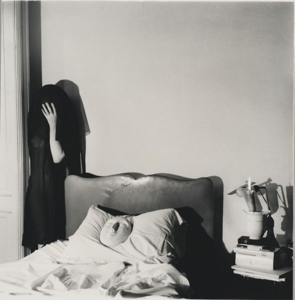 Curator: Immediately, there’s a strange, quiet energy here. The greyscale palette really pushes the viewer into a contemplative space, almost like a faded memory. And the subject matter—domestic, but so oddly staged. What is your impression? Editor: We are looking at James Casebere's photographic print, likely made between 1975 and 2001, titled "Fan as Eudemonist: Relaxing after an Exhausting Day at the Beach". It strikes me as a miniature stage set for some existential drama. Curator: Precisely! All of those crisp lines! It reminds me of Piranesi’s prisons. It looks like someone is waiting for an imaginary train, with a cardboard suitcase on the floor. A window on the top right with odd paper decorations seems like something by Magritte, while the electrical outlet… gives some juice to the otherwise still composition. Editor: Right! It is that stark contrast between the playful absurdity and the formal arrangement that grabs me. Think about it: meticulously constructed from simple materials and lit just so, only to depict the ridiculousness of a burnt-out box fan "relaxing". Casebere loves those kinds of juxtapositions, and he does it to ask big questions. Curator: Almost daring us to ask questions, or even care about what this all "means," and even the artist wouldn't necessarily know the exact intention himself, isn’t it so? The fan and the socket; are those related? Do the parallel lines in the fake window mean to indicate energy and direction? How did this arrangement emerge in his imagination? Is this artwork "of its time?" Did it respond to, influence, or challenge previous works? Editor: He uses architecture, the history of it, and space—its sociology. So, in effect, "Fan" uses domestic props, things and arrangements everyone would recognize but he turns them into spaces where societal conventions get unmasked or undermined. Curator: Definitely food for thought—a whimsical and slightly unsettling commentary on our expectations of art and the mundane. Editor: Agreed, something about the carefully constructed artificiality of it is also oddly comforting. Curator: I hadn't considered that. I find this artwork much more provocative now!
