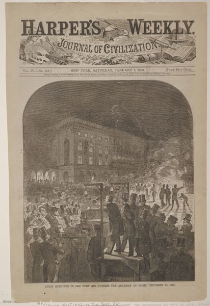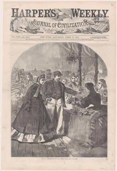 This cover of "Harper's Weekly," from June 1861, by Winslow Homer, presents us with a scene rendered through the stark contrasts of black and white engraving. A group of women are clustered together in a domestic interior, engaged in sewing what the title identifies as havelocks for the volunteers. The composition is structured around this intimate gathering, yet the scene is framed by elements that hint at a world beyond the domestic. A window, partially obscured by foliage, offers a glimpse of the outside, while a draped flag introduces a note of patriotic duty. The visual language here constructs a narrative around the women and their position to the unfolding events of the American Civil War. Homer's use of line and form creates a sense of depth and texture, inviting the viewer to consider the relationship between the private sphere of domestic labor and the public sphere of war and national identity. It destabilizes conventional notions of gender roles, suggesting that these women are active participants in a conflict fought on distant battlefields. It invites us to consider the role of images in shaping public opinion and understanding of historical events.