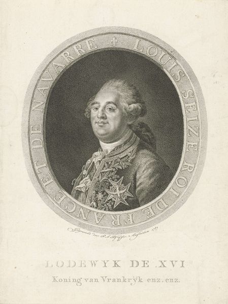 Curator: The piece we're viewing is an engraving, "Portret van Lodewijk XVIII Koning van Frankrijk," created after 1814 by Antoine Alexandre Joseph Cardon. It's a study in contrasts, both stark and subtle. What's your initial read? Editor: Immediately, the abundance of ornamentation strikes me. Medals, sash, even the coat's detailing, feel almost overwhelming against the figure's somewhat placid expression. It's a visually busy portrait. Curator: The symbolism, particularly in the medals, conveys royal authority, recalling his lineage and restored power during a period of French history marked by dramatic upheaval. The French desired the return of the Monarchy! Editor: Indeed, and Cardon uses a precise, almost clinical line to delineate each element, which is typical for Neoclassical prints. The hatching is exceptionally tight, achieving subtle gradations in tone, but to what effect? Is it purely representational, or does it aim to evoke a specific feeling? Curator: I see the engraving as a calculated image crafted to inspire legitimacy, tapping into collective memory of monarchy. Look at his distant gaze, evoking statesmanship. This connects with the restoration movement within French society at the time. The symbols of royal authority helped reconstruct the shattered image of the Bourbon monarchy, using visual communication to rewrite recent, unsettling historical memory. Editor: It's as though every mark is deliberately placed to achieve a certain effect. This reminds me of structuralist interpretation which would argue that such meticulous detailing subordinates individuality to the formal system of representation. The print thus reasserts the traditional code of the monarchy above everything. Curator: Yes! His very physical presence becomes secondary. Ultimately this becomes an object about authority and collective will as perceived in France. It also embodies both a return to, and the challenges of reinstating cultural continuity during a period of political restructuring and national identity reformation. Editor: This print succeeds formally and politically, I suspect. Looking closer I start to feel I understand a little bit more of that transformative, revolutionary era. Curator: A small window into a fractured era, through the focused lens of visual intention.