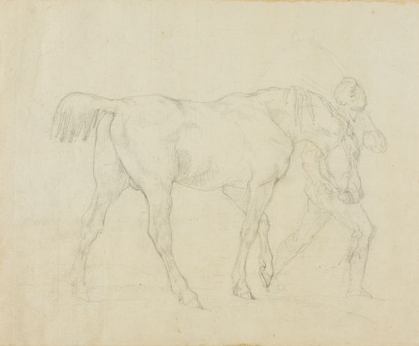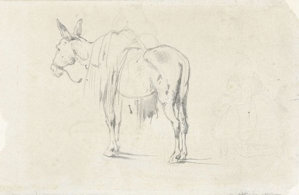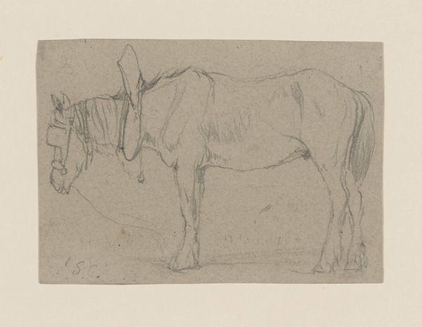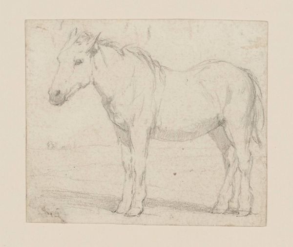 Curator: Observing Jan Kuyper's "Studies van een Paard," dating roughly from 1855 to 1912, I immediately get a sense of transience, like capturing a fleeting moment in pencil on paper. Editor: Fleeting, yes, but also revealing of the deeply ingrained relationship between humans and horses within a particular societal structure. Think about how crucial horses were for labor, transportation, even warfare during this era. This drawing, seemingly simple, speaks to a history of power and dependency. Curator: It feels almost ethereal to me. The unfinished quality of the lines hints at movement, a gentle dance frozen in time. You can almost feel the soft warmth of the horse just by looking at this piece. It’s really interesting what is not actually shown. Editor: The sketch's incompleteness mirrors the larger social dynamics at play, though. It begs the question of who owned or commissioned a study like this. Class divisions influenced the subjects people had the leisure to depict. Even seemingly neutral images like these are rarely detached from their historical circumstances. Curator: Maybe, but couldn’t it also be the artist simply trying to grasp the form? To just… feel the energy of the horse flow through his pencil? Not everything has to be related to socioeconomic factors. Can we, just for a moment, allow art to be intuitive? Editor: I understand the desire for intuition, but these are not mutually exclusive. Art IS always intuitive and born of impulse, but even spontaneous art arises in the face of social considerations. Consider gender too; being a male artist grants an automatic privilege of expression often denied to women of that era. We should ask whose stories and experiences are represented in collections like this. Curator: Ah, but the beauty lies, in a certain sense, beyond these limits that were defined for and against others, the very act of creation being an assertion of existence, if I might take it there. Anyway, look at how he subtly suggests weight and muscle, and manages to capture the stillness of the horse with such minimal effort, using delicate shading! It gives us an immediacy. It is absolutely divine! Editor: Divine yes, but this brings up other social and labor dimensions too! Where was the horse located, who attended it, who were these workers and where is their perspective here. I concede that it is quite good as far as capturing weight and texture! I believe it calls to reflect about who produces or consumes a cultural item, for to simply aestheticize an artwork such as this risks obscuring underlying injustices. Curator: Well, on that note, I feel like I’m understanding a little more deeply how you view art! Editor: As I understand your perspective, as well.
