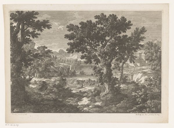Nicolas Perelle created this rivierlandschap met vier figuren with pen and brown ink, brush in grey, over black chalk, around 1651-1695. At first glance, this seems a simple landscape. However, during the 17th century, landscapes were more than mere depictions of nature. They often served as stages for narratives reflecting social hierarchies and cultural values. Look closely, and you'll notice the four figures. Are they travelers, or locals? What is their relationship to the land? Perelle's work invites us to consider how people interact with and perceive their environment. The figures seem dwarfed by the landscape around them, a reflection of the period's focus on the power of the natural world. While appearing traditional, this landscape subtly challenges us to think about our place within the world, and the stories we tell ourselves about it.