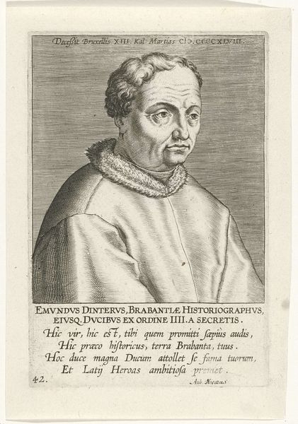 Curator: Before us is a work titled "Portret van Jacobus Latomus," created in 1572 by Philips Galle. It currently resides in the Rijksmuseum. My immediate thought is the stark contrast of light and shadow; it really grabs your attention. What's your take? Editor: I'm immediately struck by the texture. The way the lines carve out the folds in the clothing, the almost metallic sheen of the fabric - it’s all crafted so deliberately. You can sense the engraver’s hand at work. Curator: Indeed. Galle, active in a period of significant religious and political upheaval, often made prints with subtle, politically charged messaging. Latomus, as a theologian, would have been a prominent figure in those debates. These portraits served a crucial role in establishing a public persona for influential people like him. Editor: And you see it reflected in the materials too. The choice of printmaking, specifically engraving, meant this image could be reproduced and widely circulated. It speaks to a desire to disseminate Latomus’s image and, by extension, his ideas to a broader audience. It makes one think of the accessibility and scale that print-making introduced compared to single painted portraits, or even manuscript illuminations. Curator: Exactly! The Latin inscription reinforces that accessibility by spreading knowledge of the theologian beyond the circles who knew him directly. But how does it connect with ideas of labor, or making do you think? Editor: Well, each line in that engraving had to be carved individually, likely after numerous drawings, so the level of focused labour, to create so precise an image is rather incredible. This craft and skilled execution adds an air of authority and lasting importance, both to the theologian and his work. Curator: I hadn't thought of it in terms of skilled execution, more the opposite really! Almost the banality of its function to proliferate his image as efficiently as possible. Still, there's undeniably skill here, whether as purely art, or political function. Editor: It makes you really wonder about all of the skilled, but maybe anonymous makers who’s efforts have worked to frame powerful images. Thanks for bringing it to my attention in all these interesting historical aspects! Curator: And thank you for grounding us with those realities, in process.