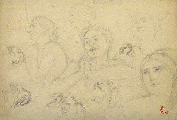 Curator: Here we have "Portretkoppen van een vrouw met het haar half opgestoken"—or "Portrait Heads of a Woman with her Hair Half Up"—created sometime between 1834 and 1906 by Maria Vos. It’s currently held in the collection of the Rijksmuseum. Editor: You know, there’s a vulnerability to these sketches; almost feels like looking into a private moment of self-reflection. They're like echoes of a fleeting thought. Curator: Vos worked during a period where women artists often faced systemic barriers, including limited access to formal art education. A sketchbook such as this provided her a vital space for exploring technique and subject matter independently. Notice how she varies her pencil pressure to achieve depth, it’s fascinating, really. Editor: It is interesting, isn't it? It’s light—literally! You can see through to the grain of the paper. But this isn't just a light touch; these different heads create a composite impression of the same person thinking, feeling through several sides of the same issue maybe. Curator: Absolutely, consider also that women in portraiture are so frequently placed within restrictive social frameworks. Sketches such as this could act as small, subversive interventions. Are we observing mere portraiture, or a subtle exploration of identity through varied perspectives? Editor: Subversive sketches—I love that! And you’re right, these studies suggest the breaking of free of an idea—a moving away from that “single truth”. It feels intensely feminine too—that sense of fluidity, of multiplicity. A singular study rendered multiple and full of self-inquiry. Curator: I completely agree. Vos here perhaps encapsulates her era and pushes gently against its edges. What might have seemed personal and inconsequential is actually very powerful and historically insightful. Editor: And beyond that insight, a reminder, perhaps, of how those silent artistic explorations can resonate through time. How wonderful.