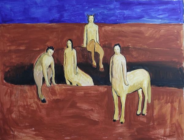 Editor: We’re looking at Kateryna Lysovenko’s "Polyxena," created in 2019 as part of the series "Works According to Descriptions". It looks like a landscape in gouache and acrylic paint. It definitely evokes a sense of myth and otherworldly wonder, featuring centaur-like figures. What do you see in this piece, and what's your take on the narrative being portrayed? Curator: Ah, Lysovenko! She possesses that rare knack for whispering forgotten stories back into existence. Here, I see a tender chaos. Note the gentle brushstrokes suggesting form and feeling rather than precise depiction. Look at how the composition pulls the viewer in different directions, as if we're intruding on a private, fantastical world, caught in its own peculiar domesticity. It begs the question: what are they looking at and what does "Polyxena" mean? Is she a protagonist, an observer, a landscape? Perhaps she represents something far more ethereal, wouldn't you agree? Editor: Definitely ethereal. I initially interpreted "Polyxena" as possibly the maternal figure holding the children, but maybe it's more of an environment or location that provides comfort and life. Curator: Exactly! This is a good question - and a bit of a mystery! What's fascinating is the playful challenge of translating descriptions into visual form. One can almost see Lysovenko giggling to herself as she decides where to bend reality, and where to tether herself to something familiar. Doesn’t that mountain range in the distance feel like a wisp of memory? I wonder, does it stir any particular emotional chord in you? Editor: I think so. It definitely contributes to a calming aura, and it balances the mythological chaos going on with the subjects in the painting. I was not expecting this conversation to be so fun! Thank you! Curator: Oh, anytime! This has been a treat for me, too! The magic lies in those unexpected detours in our minds. Isn’t that where the real art happens, after all?