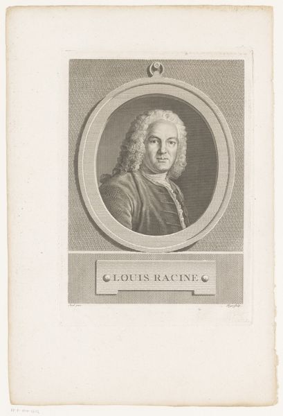Editor: Here we have Jean Charles Le Vasseur’s engraving, "Portret van Jean (I) Restout," dating somewhere between 1744 and 1816. The intricate lines and monochromatic tones create a rather formal, almost austere, impression despite the baroque flair. How do you approach an engraving like this? What details stand out to you from a purely compositional point of view? Curator: This print demonstrates the power of line and texture to define form. Observe the artist's strategic deployment of hatching and cross-hatching. These create subtle tonal gradations, defining the contours of Restout's face, clothing, and hair. Editor: So the interplay of light and shadow isn’t just representational, but fundamentally structural? Curator: Precisely! Note, too, how the circular frame isolates Restout. This compositional choice concentrates the viewer's focus, while also referencing the tradition of portrait medallions. It’s a conscious play with form. Moreover, consider how the directionality of lines influences visual rhythm and, hence, guides the viewer's eye throughout the composition. Do you observe any diagonal lines within this portrait that suggest movement? Editor: I see how the lines flow from the top of his hair down to the paintbrush and palette, drawing your eye across the image. Curator: Exactly! So, what does this linear construction communicate to us beyond the mere likeness of a person? Editor: It shows how a composition's linear structure shapes perception, emphasizing movement, framing, and ultimately, meaning. Curator: Indeed. Hopefully you can take such lessons and look for the same structure in any kind of artwork.