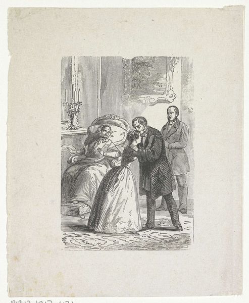 This is a print made by Johannes Henderikus Morriën, depicting an interior scene with a woman, a man pulling another man's hair, and a dog. The act of pulling hair is central here, laden with meanings that stretch across time. Observe how the aggressor wields a stick, almost like a conductor, making the other man dance as a puppet. This motif of dominance through physical control echoes through art history, reminding us of scenes of subjugation from ancient Roman frescoes to medieval depictions of torture. The shame of the submissive figure, kneeling with hands clasped, is a primal display of defeat. In this scene, the cool indifference of the woman is equally striking. She represents the object of desire, the silent judge whose gaze fuels this power dynamic. This eternal triangle—aggressor, victim, and desired—speaks to the depths of human relationships, a recurring drama played out across different eras and artistic expressions. This act embodies aggression, power dynamics, and the eternal dance of human relationships.
