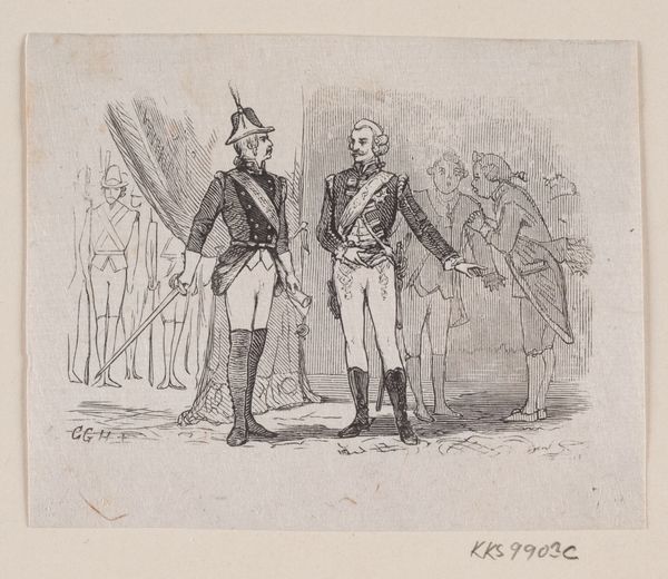 Curator: Welcome. We're standing before Pieter van Loon's drawing, "Boekverkoper met klant voor een boekenkraam," placing us in front of a book stall somewhere between 1811 and 1873. Editor: My first thought? A dry wit hangs in the air of this scene. The elongated figures almost feel like they’re acting out a private joke, don’t they? Curator: Precisely. Van Loon’s work, rendered in pen and pencil, utilizes a very particular type of academic realism. The figuration is key—look at the deliberate caricature; the contrast of textures achieved solely through line work... Editor: They look a bit severe, especially the book seller, but is he making fun of his customers or his work? He reminds me of shopkeepers I knew when I was a kid. He has that manner about him of being completely detached, like he's resigned himself to his workaday existence. Curator: It's worth considering the text scrawled beneath the drawing, too. Editor: Right! How are great writers sometimes appreciated in foreign countries... there’s something self-aware in its placement that gives the drawing another layer, no? Curator: Absolutely. The visual elements combined with the textual underscore point towards a pointed commentary on both the appreciation of literature, and potentially the role of the seller within that transaction. Editor: The beauty, to me, is how he manages to pack so much into such an apparently simple sketch. The subtle body language, the precise economy of line...you just get the sense these two know their routine backwards and forwards. It's both comical and a tiny bit sad, like a perfectly observed short story. Curator: Indeed. The very sparseness of materials only underscores how effective the composition is overall, communicating far more with the most minimal tools, achieving both character and social commentary. Editor: To think a simple drawing of a bookseller and his customer could reveal so much...art has the knack of throwing a mirror to our own daily rituals, no?